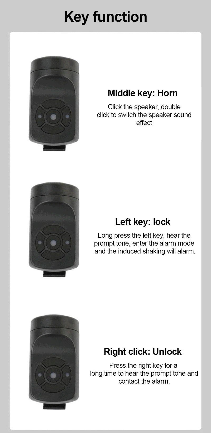 2. Многорежимный дизайн: его можно использовать в качестве автомобильного звонка или в качестве будильника, долго нажимайте левую кнопку для переключения, одна вещь, двойного назначения, безопасный и Противоугонный.