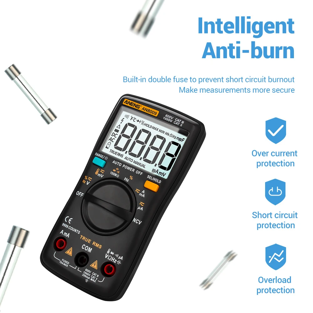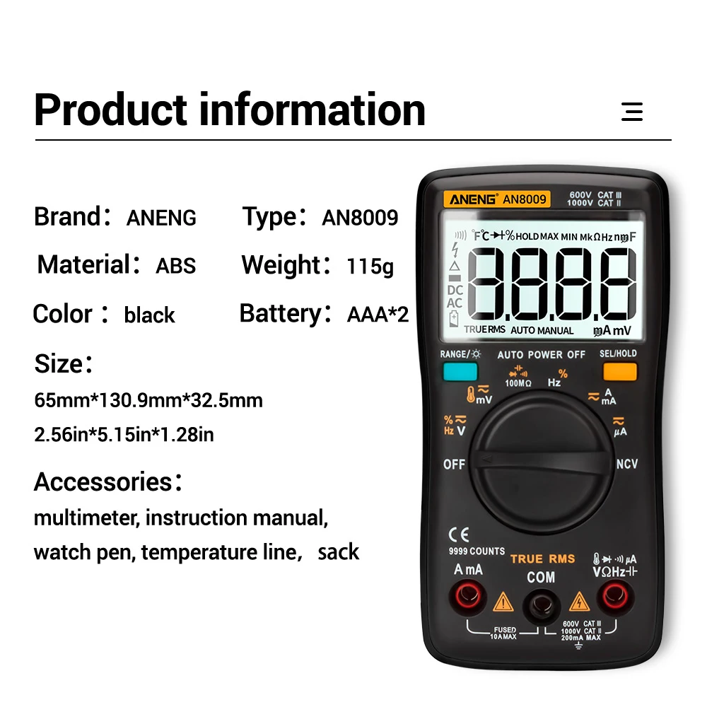 Посылка включает в себя:Мультиметр (1 шт.);1 х тестовый свинец + датчик температурыРуководство пользователя (1 шт.)Сумка для хранения-1 шт.1 х 16 шт. тестовый зонд (Выберите от пакета)Примечание:1. Не превышать "Максимальное значение", указанное в спецификации;2. Не входное напряжение в режиме тока, режим сопротивления, диодный режим, режим непрерывности или температурный режим;3. Не используйте продукт, когда батареи или крышка батареи не расположены правильно;4. Выключите продукт и удалите Тестовые провода из тестовых точек перед заменой батарей или предохранителей.5. Не превышает входное напряжениеЕ-байка 36ВПостоянного токаАлюминиевая крышка, 25ВПеременный ток при настройке измерения тока.