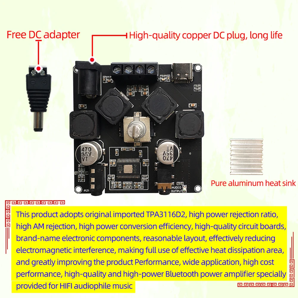 Этот продукт принимает Оригинальное импортированное TPA3116D2, с коэффициентом подавления высокой мощности, подавлением высокой AM, высокой эффективностью преобразования энергии, высококачественной печатной платой и крупными фирменными электронными компонентами. Расположение разумно, что может эффективно уменьшить электромагнитные помехи, полностью использовать эффективную площадь рассеивания тепла и значительно улучшить производительность продукта. Он широко используется и экономически эффективен. Это высококачественный высокомощный Bluetooth-совместимый усилитель мощности, специально для HiFi fever music
