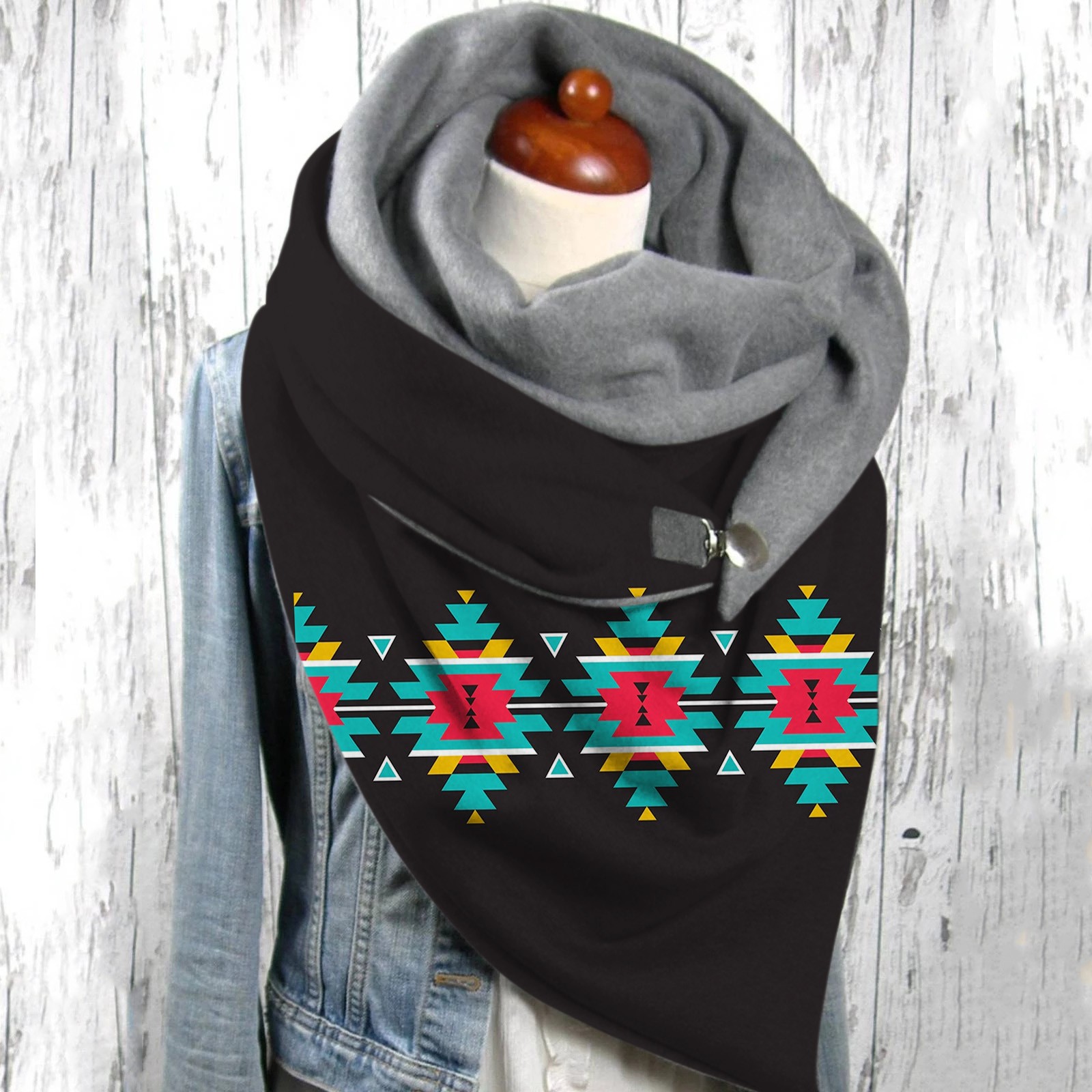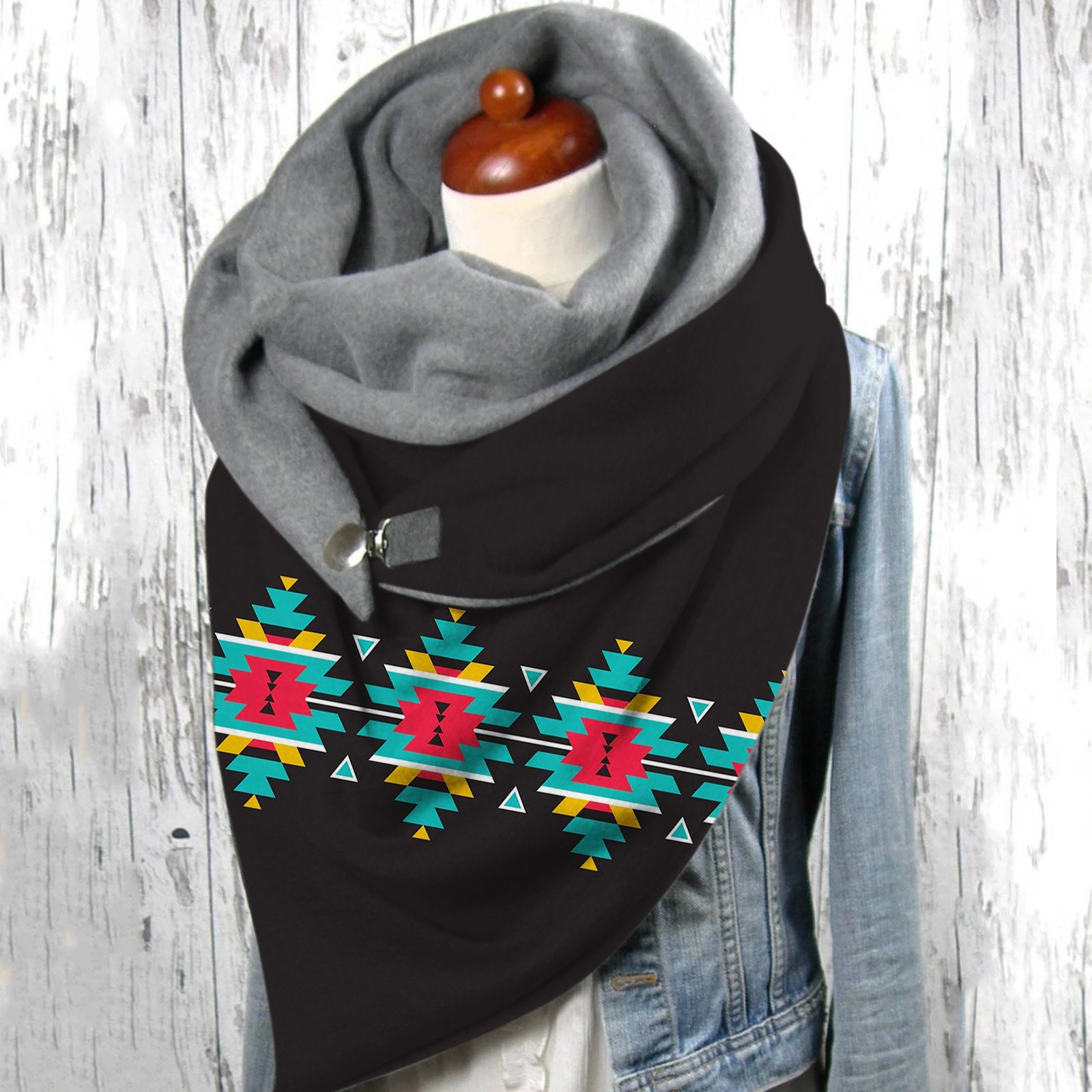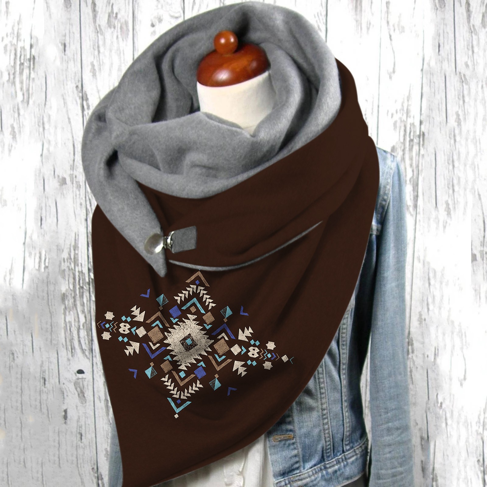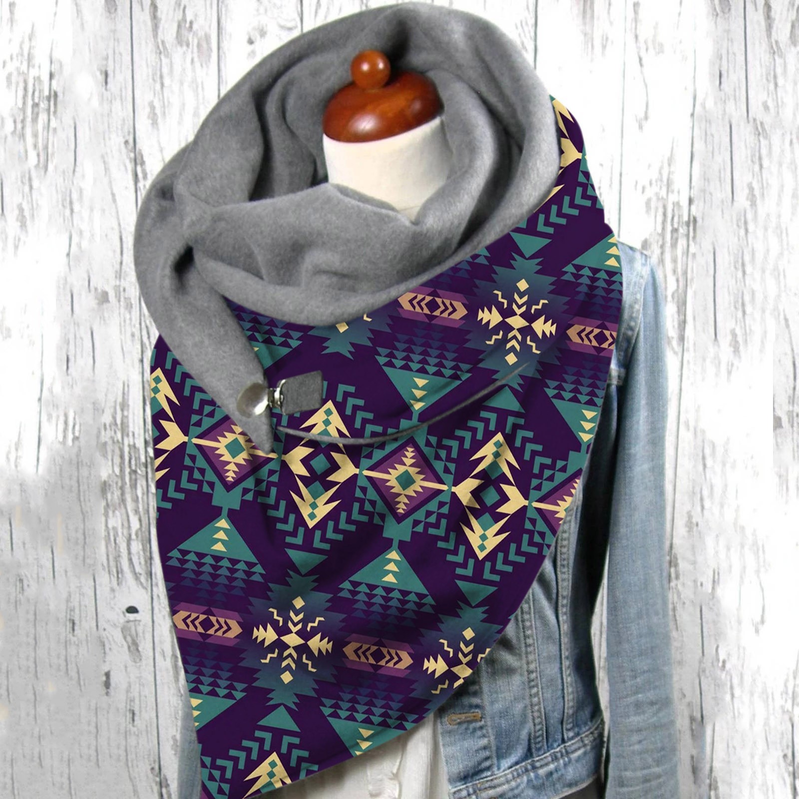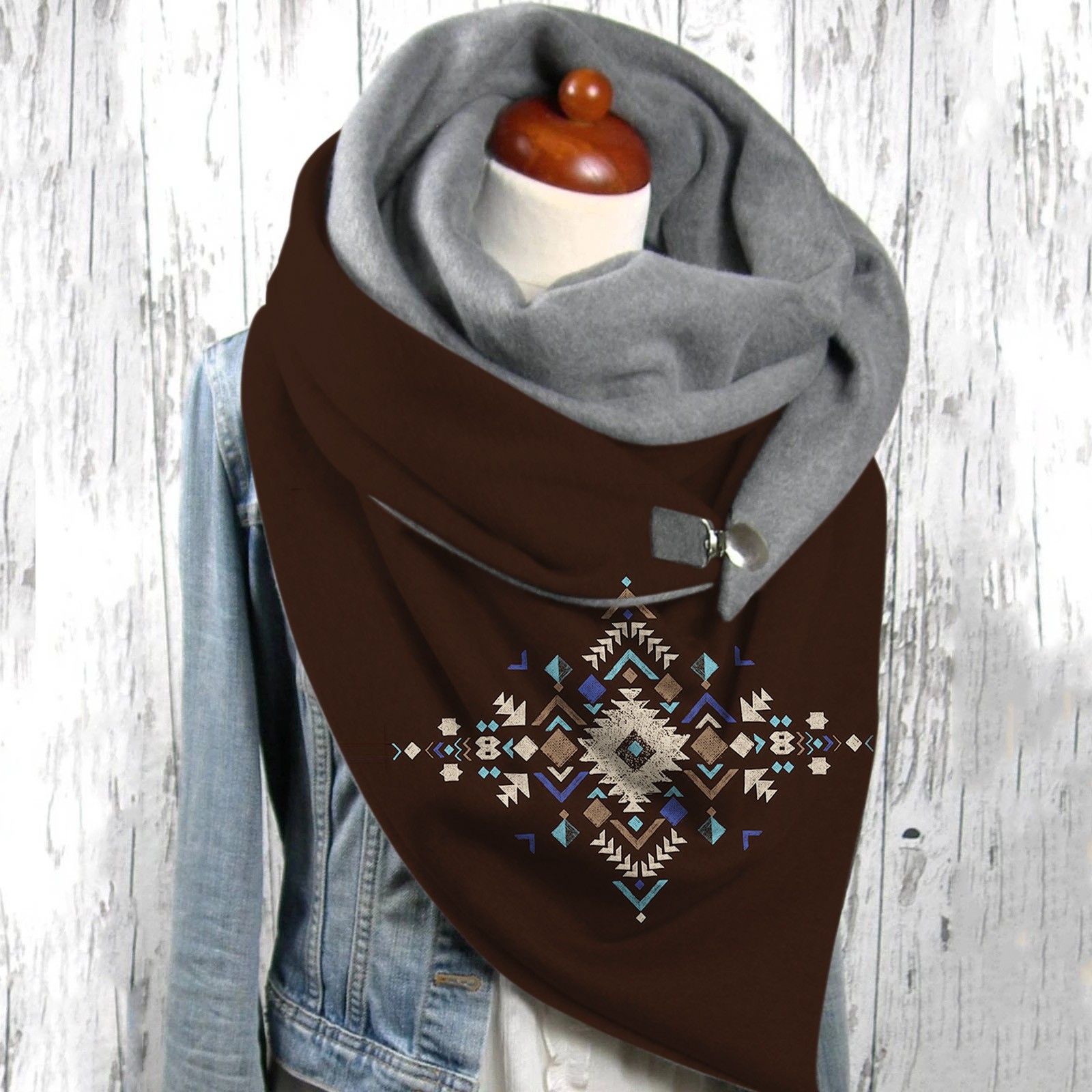 Универсальный теплый двухслойный шарф с геометрическим принтом и пряжкой на осень и зиму