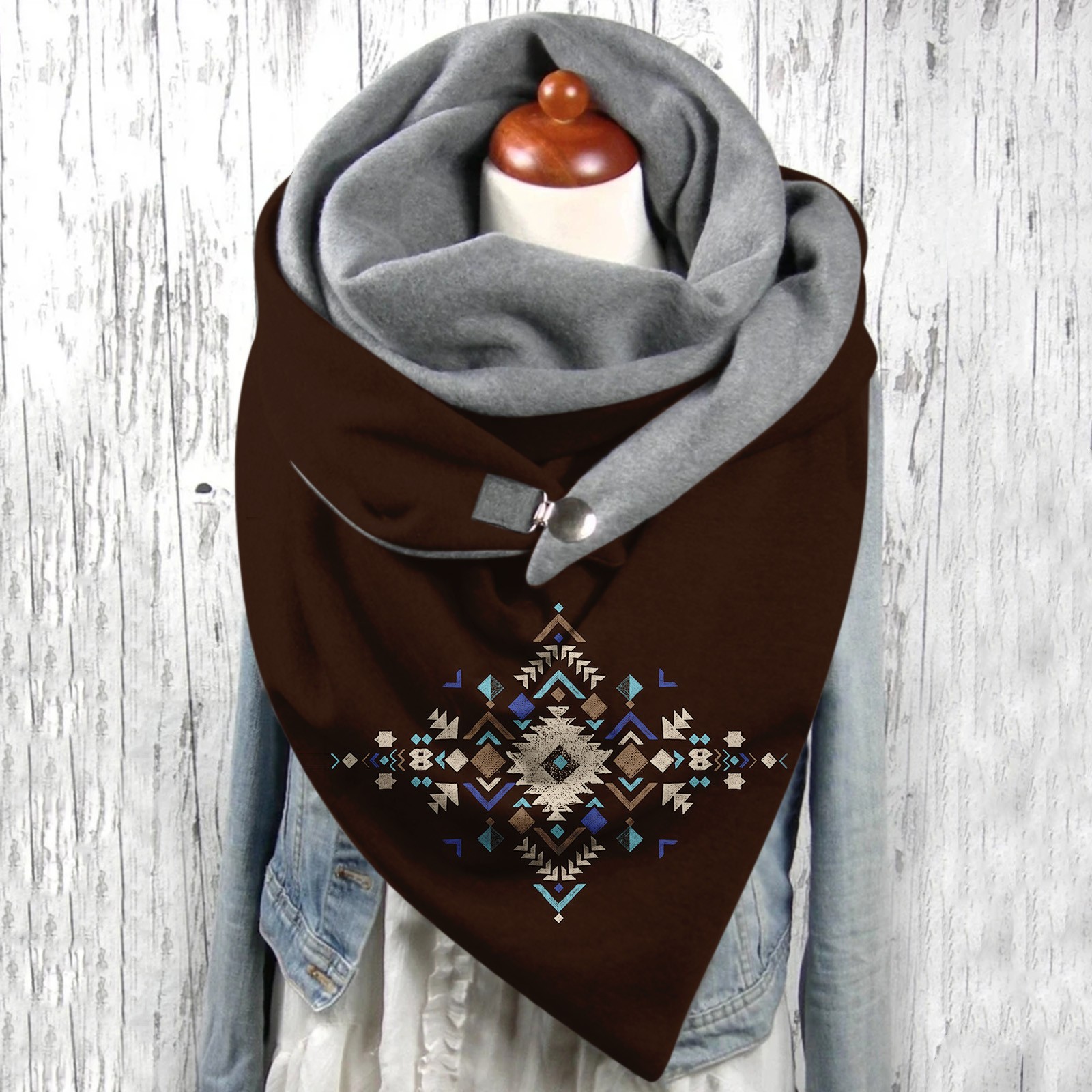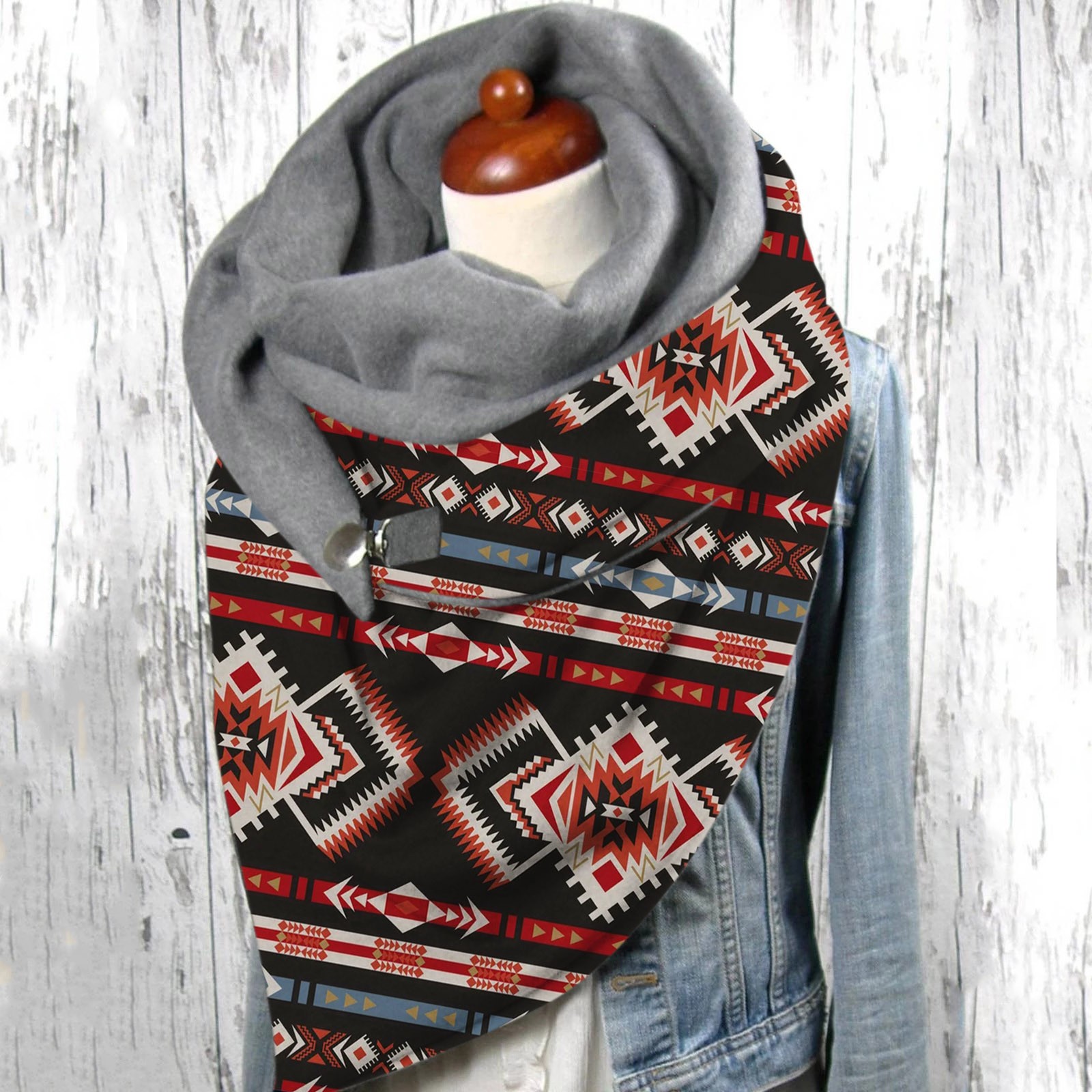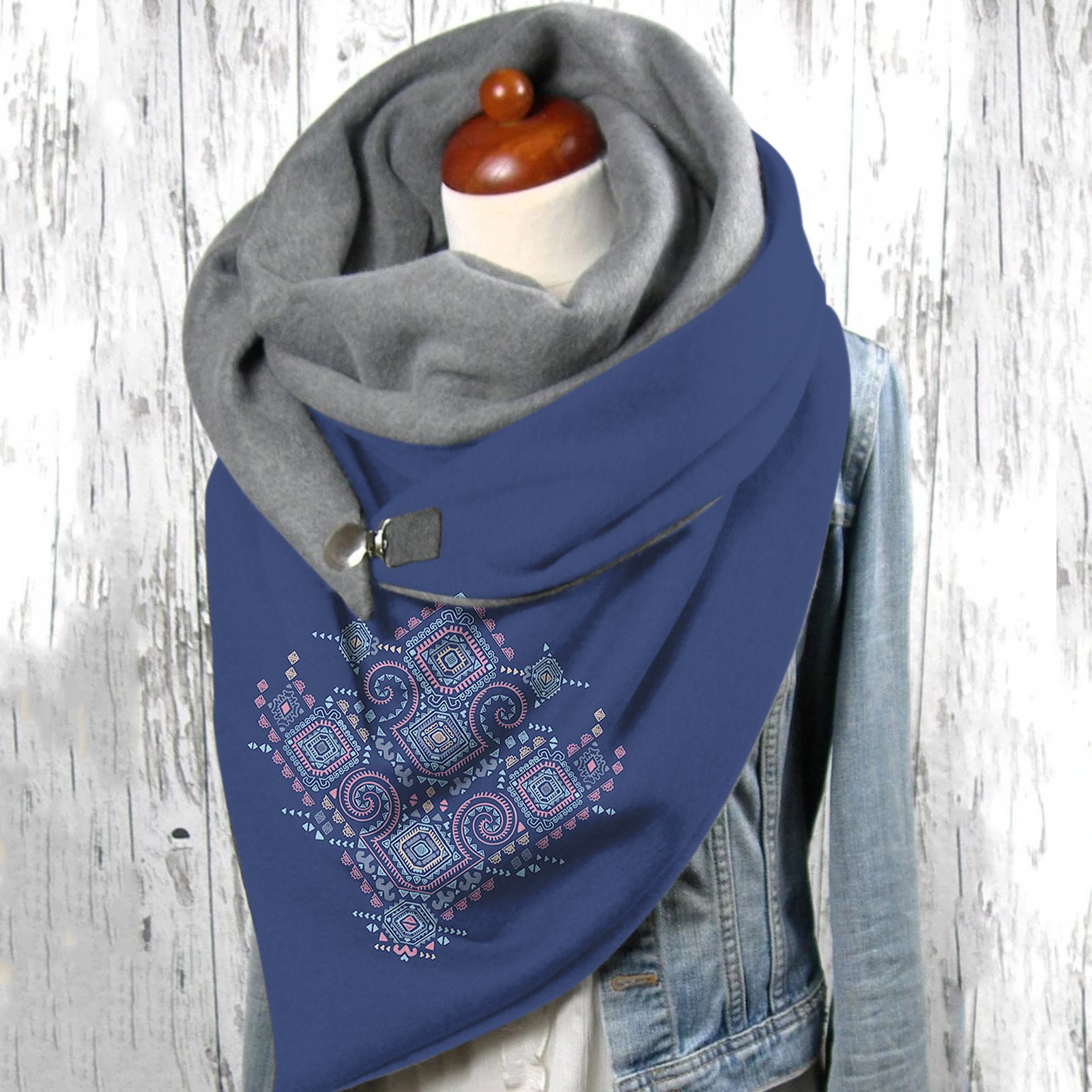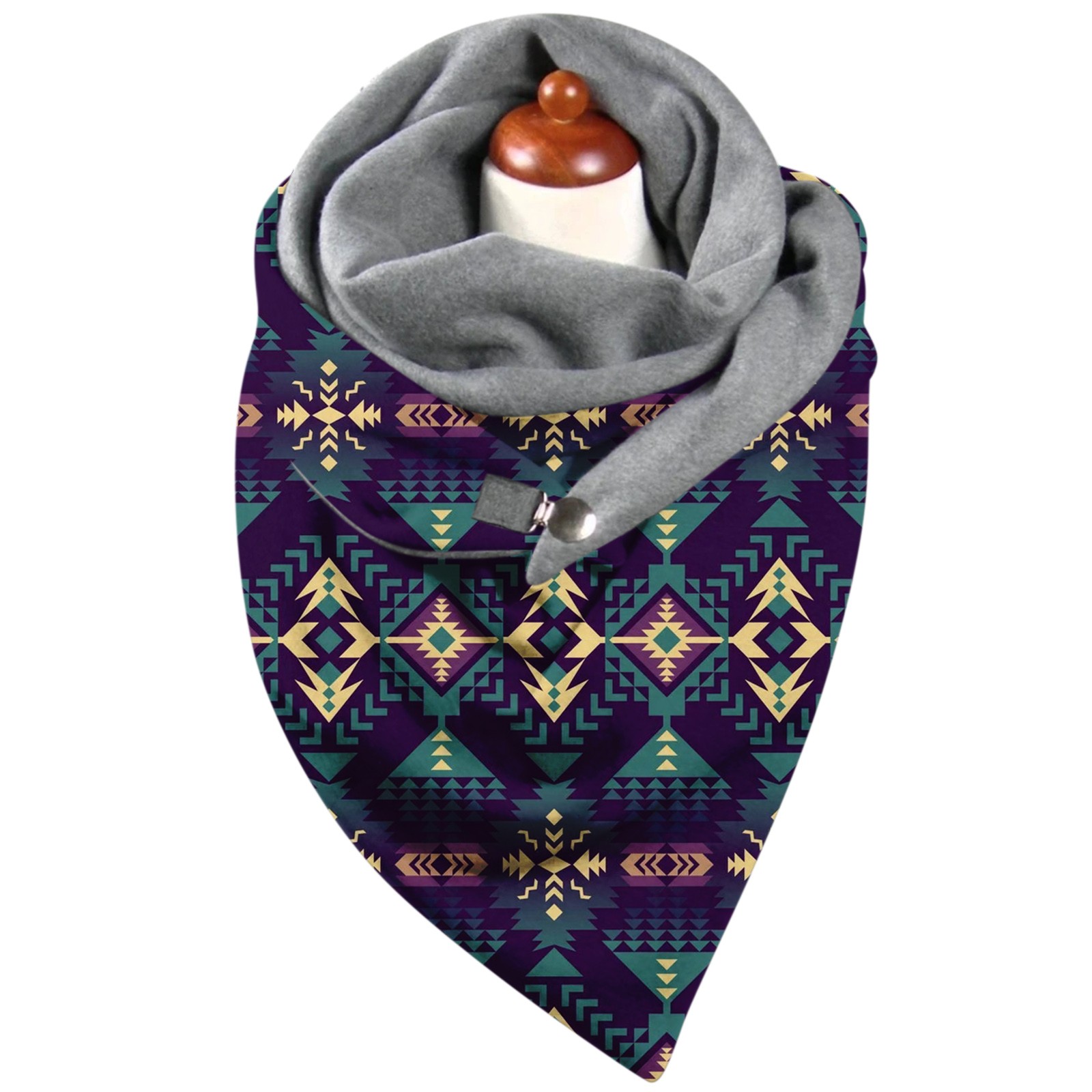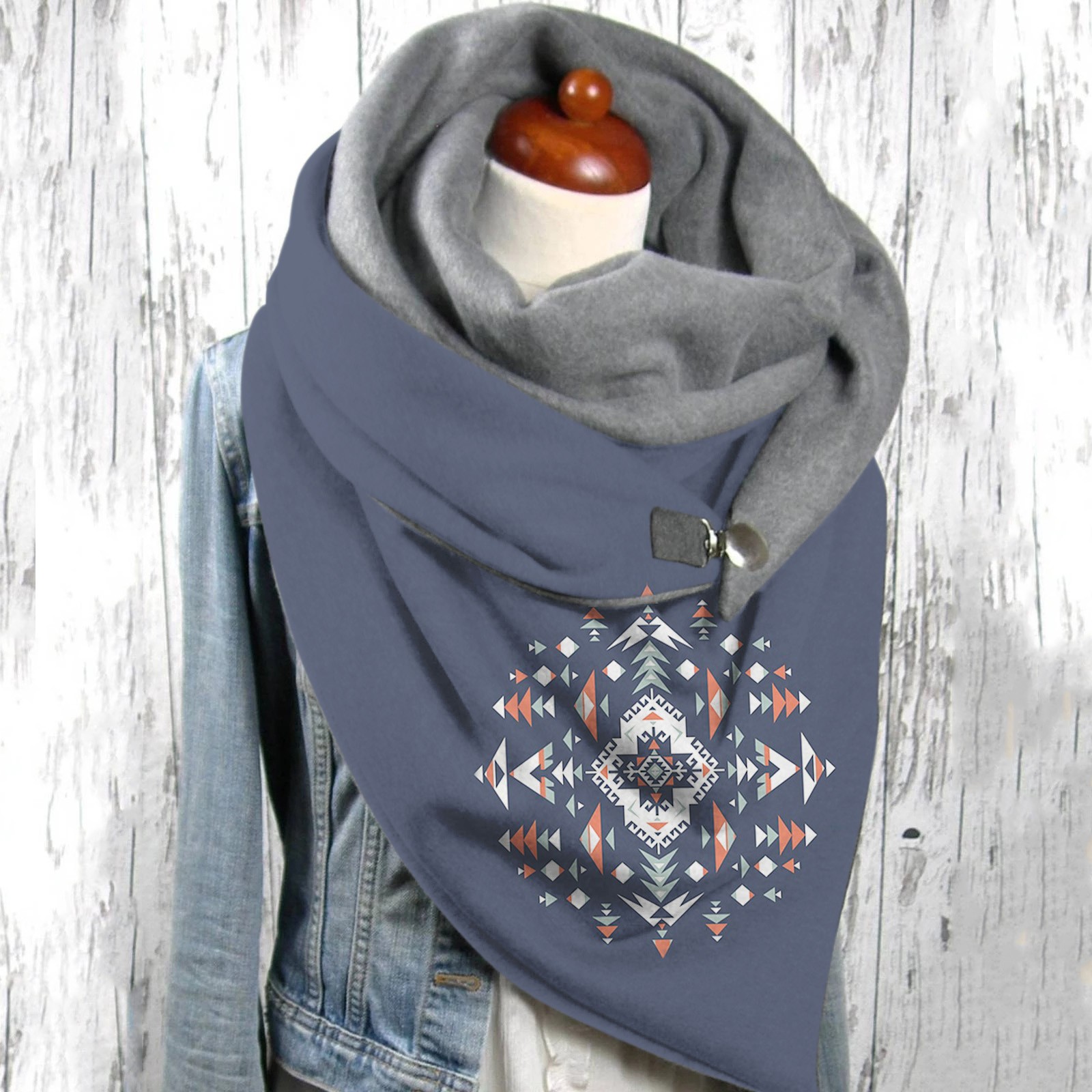 Универсальный теплый двухслойный шарф с геометрическим принтом и пряжкой на осень и зиму