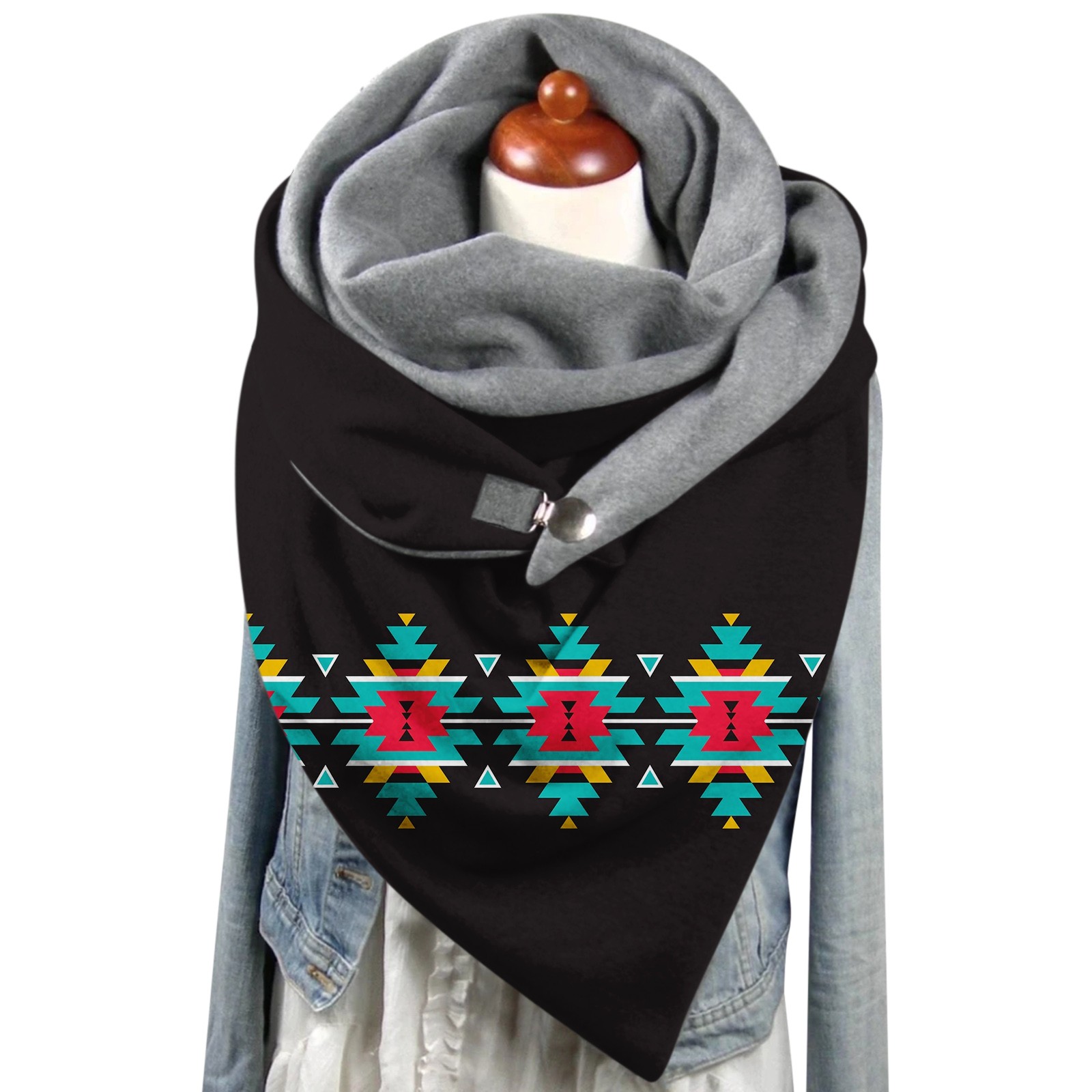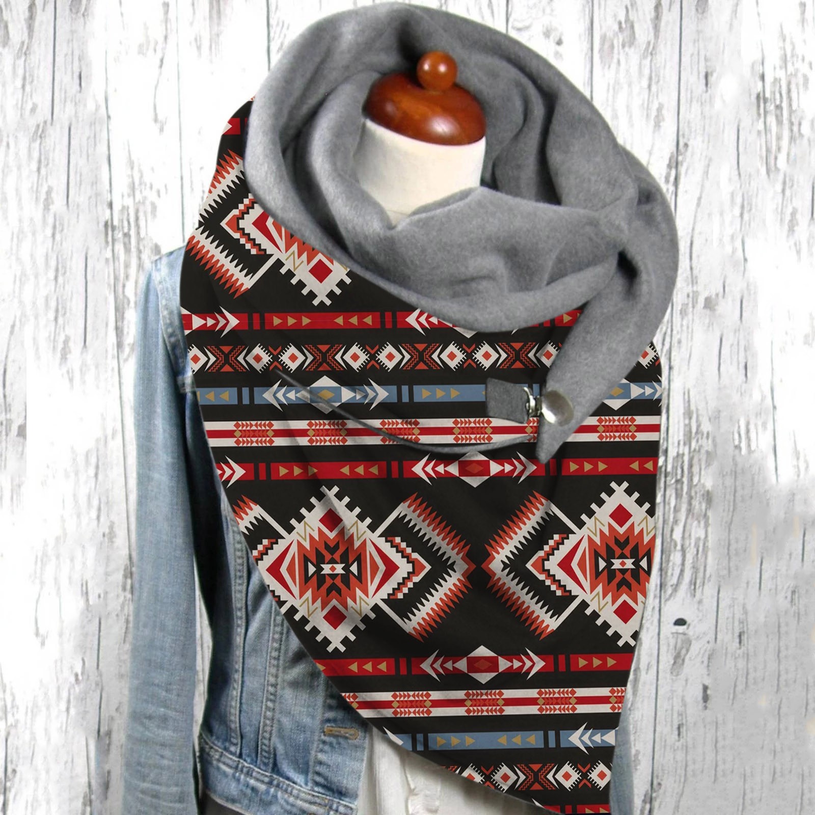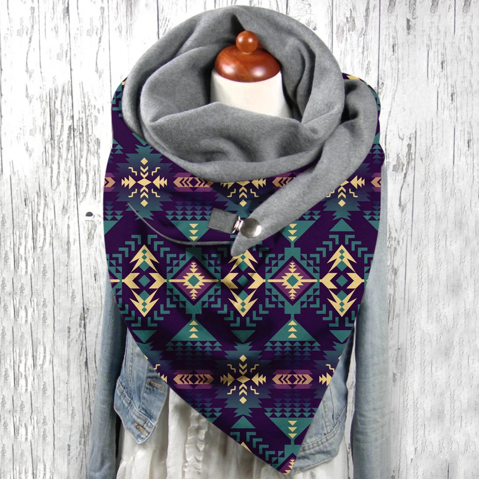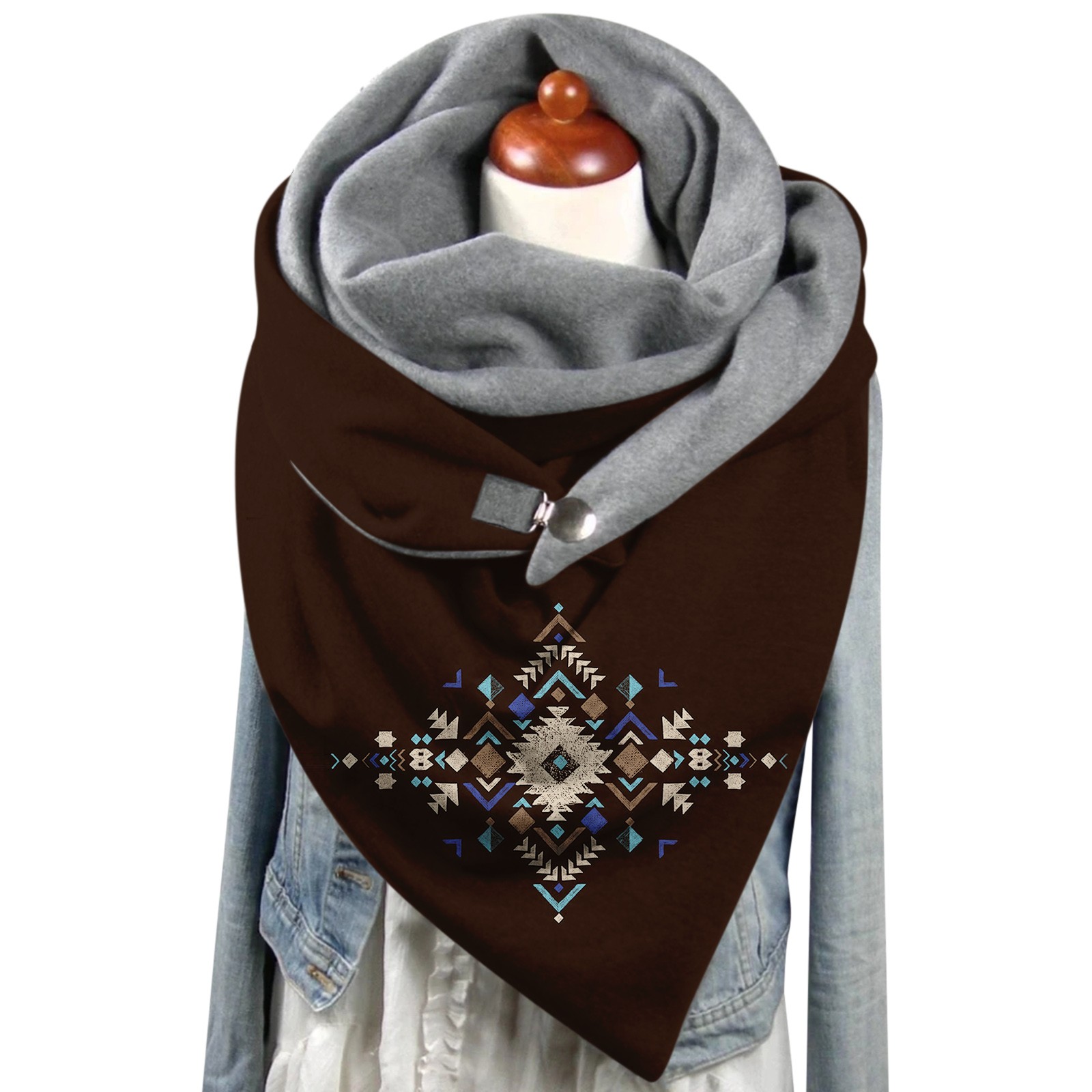 Универсальный теплый двухслойный шарф с геометрическим принтом и пряжкой на осень и зиму