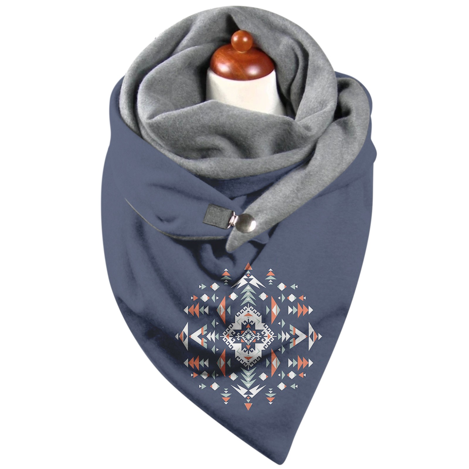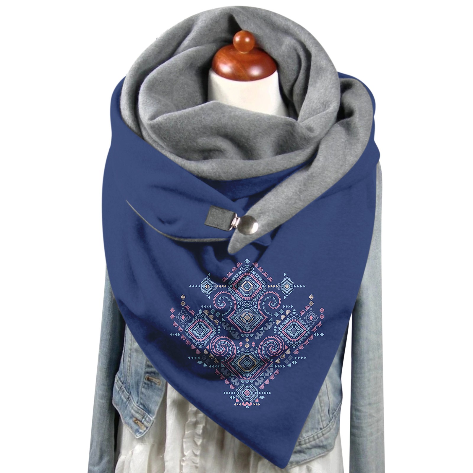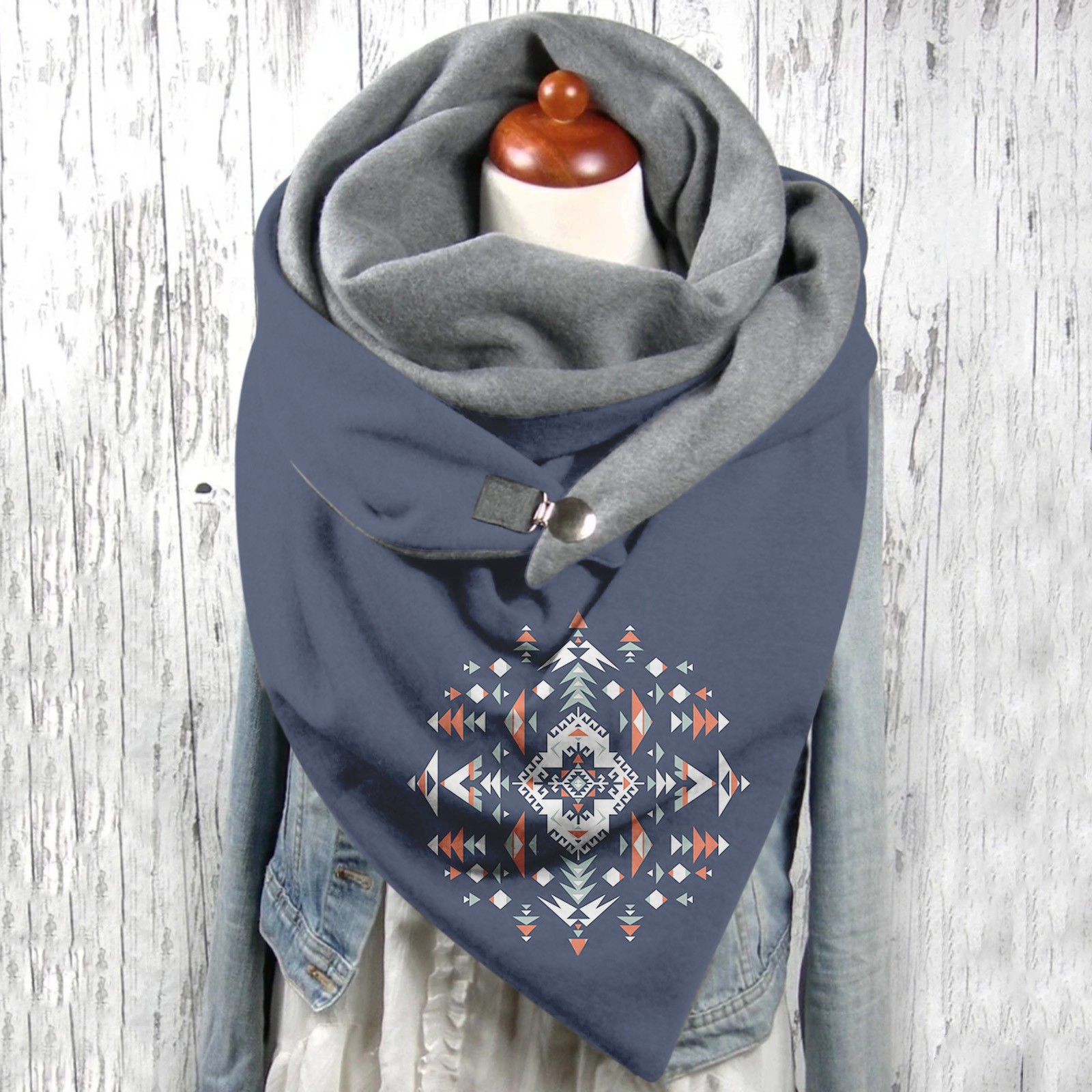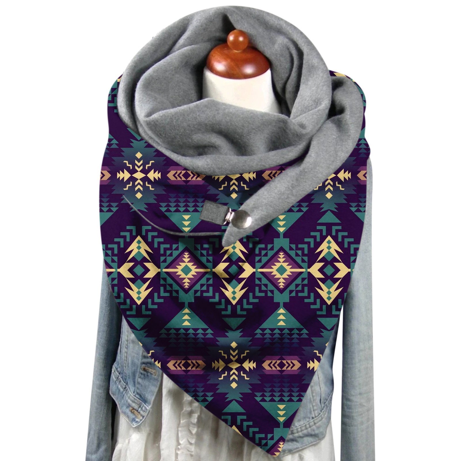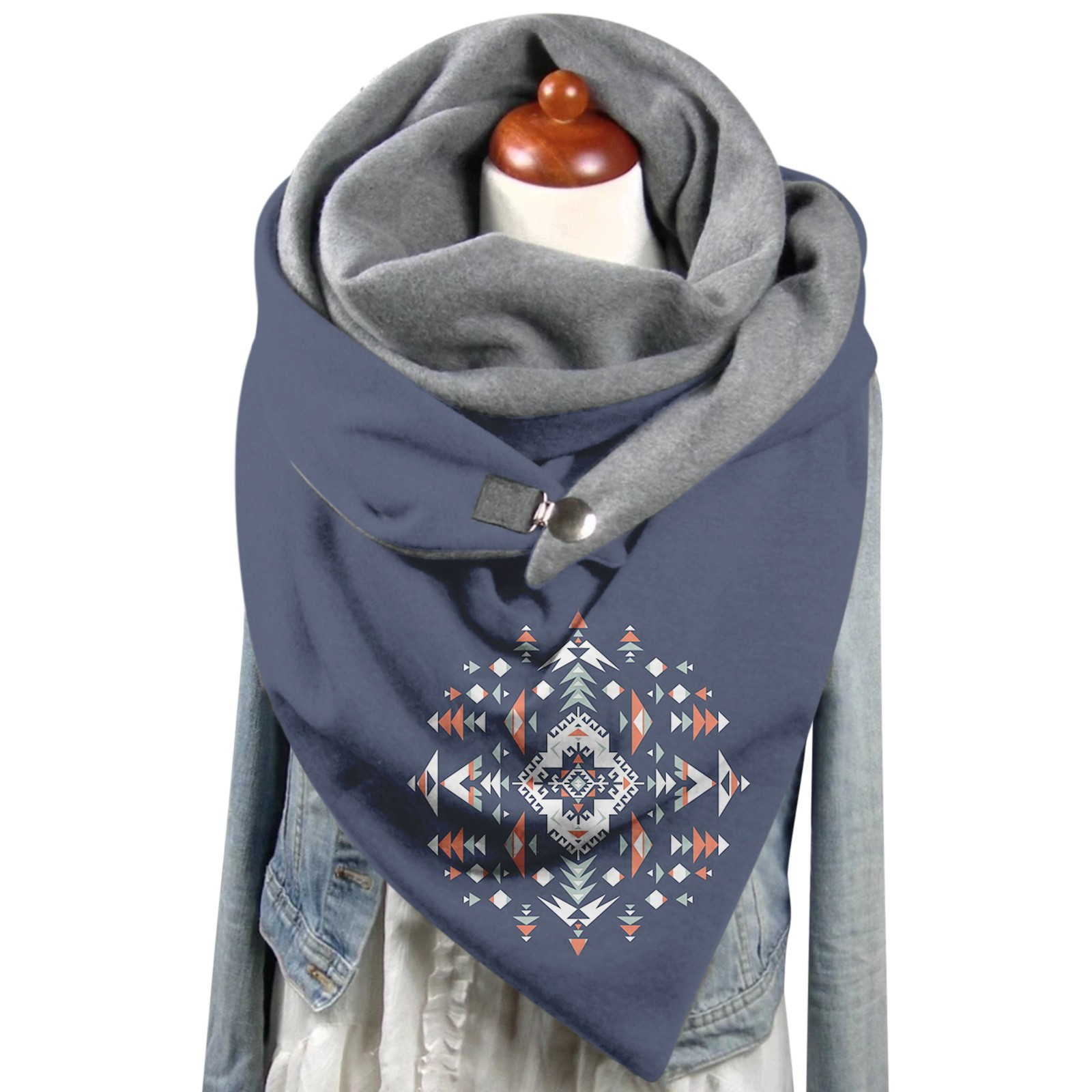 Универсальный теплый двухслойный шарф с геометрическим принтом и пряжкой на осень и зиму