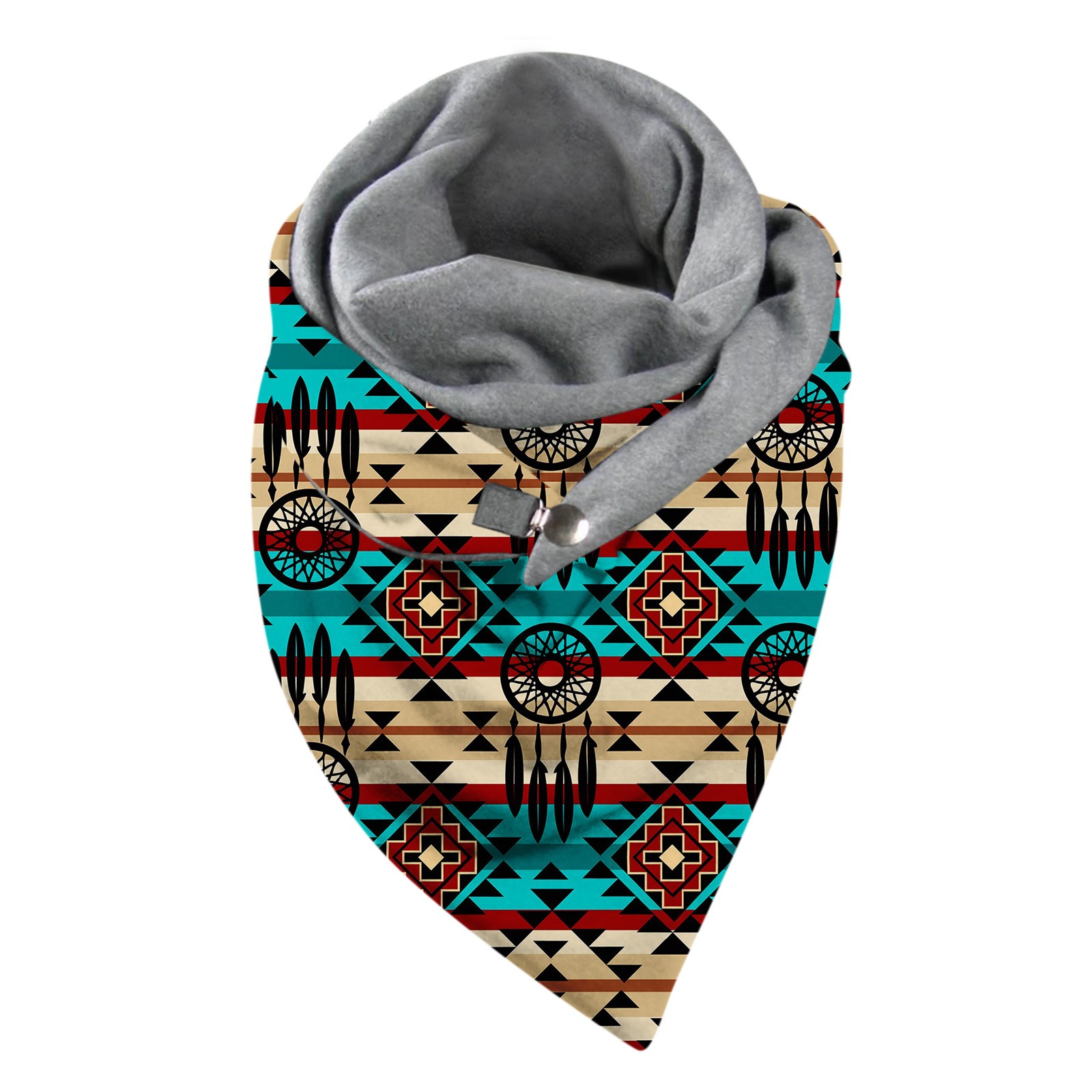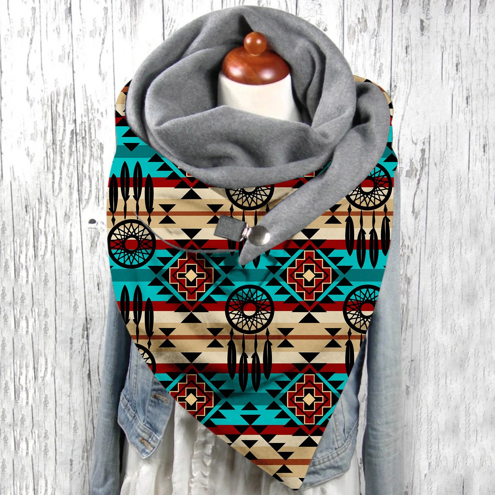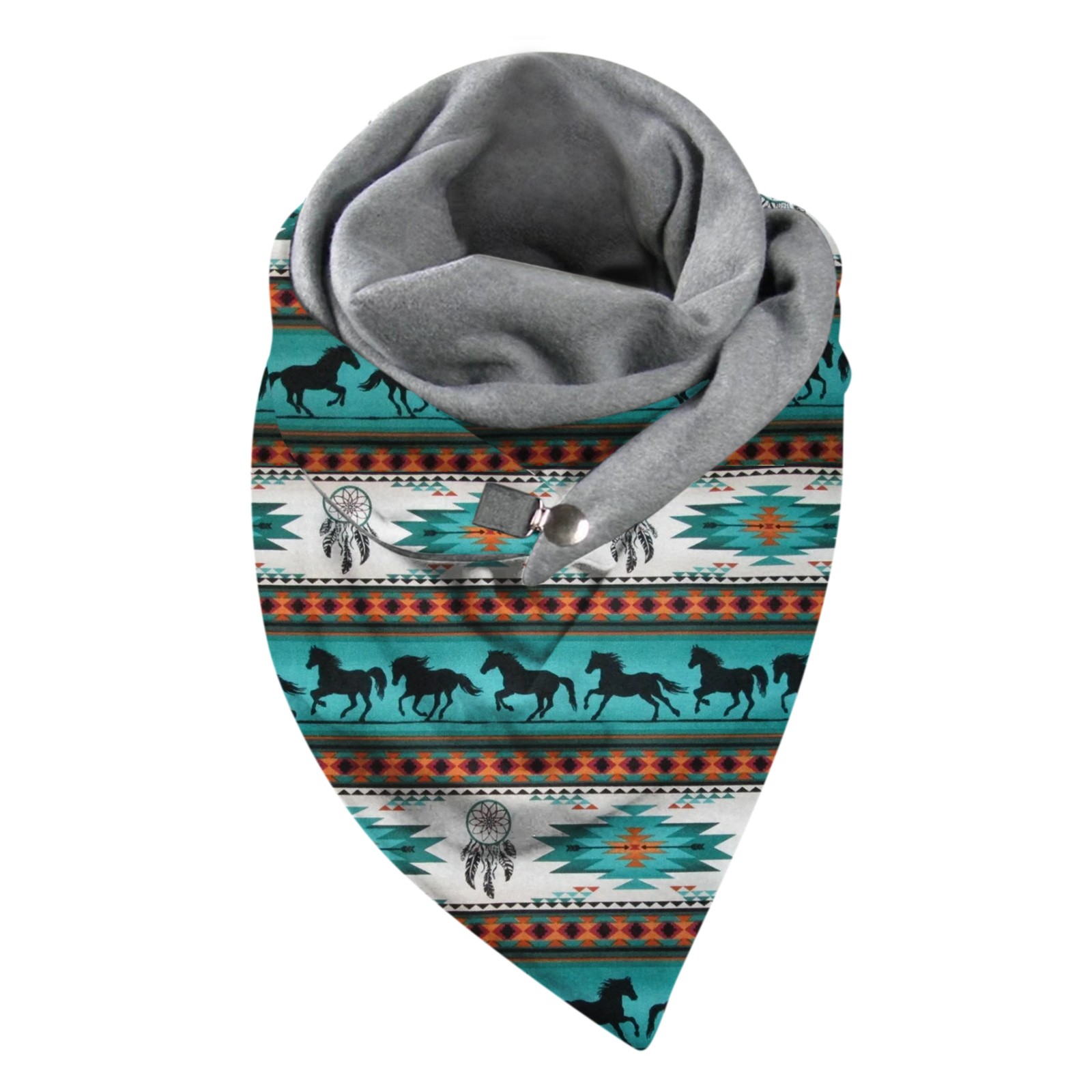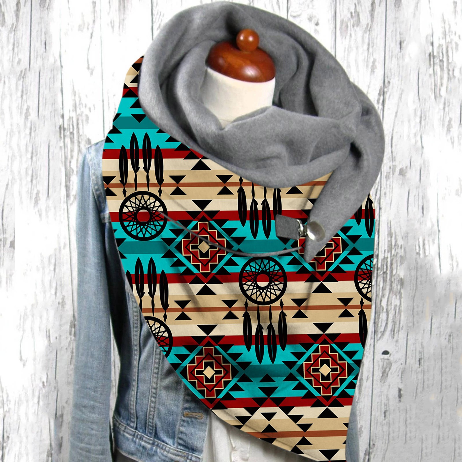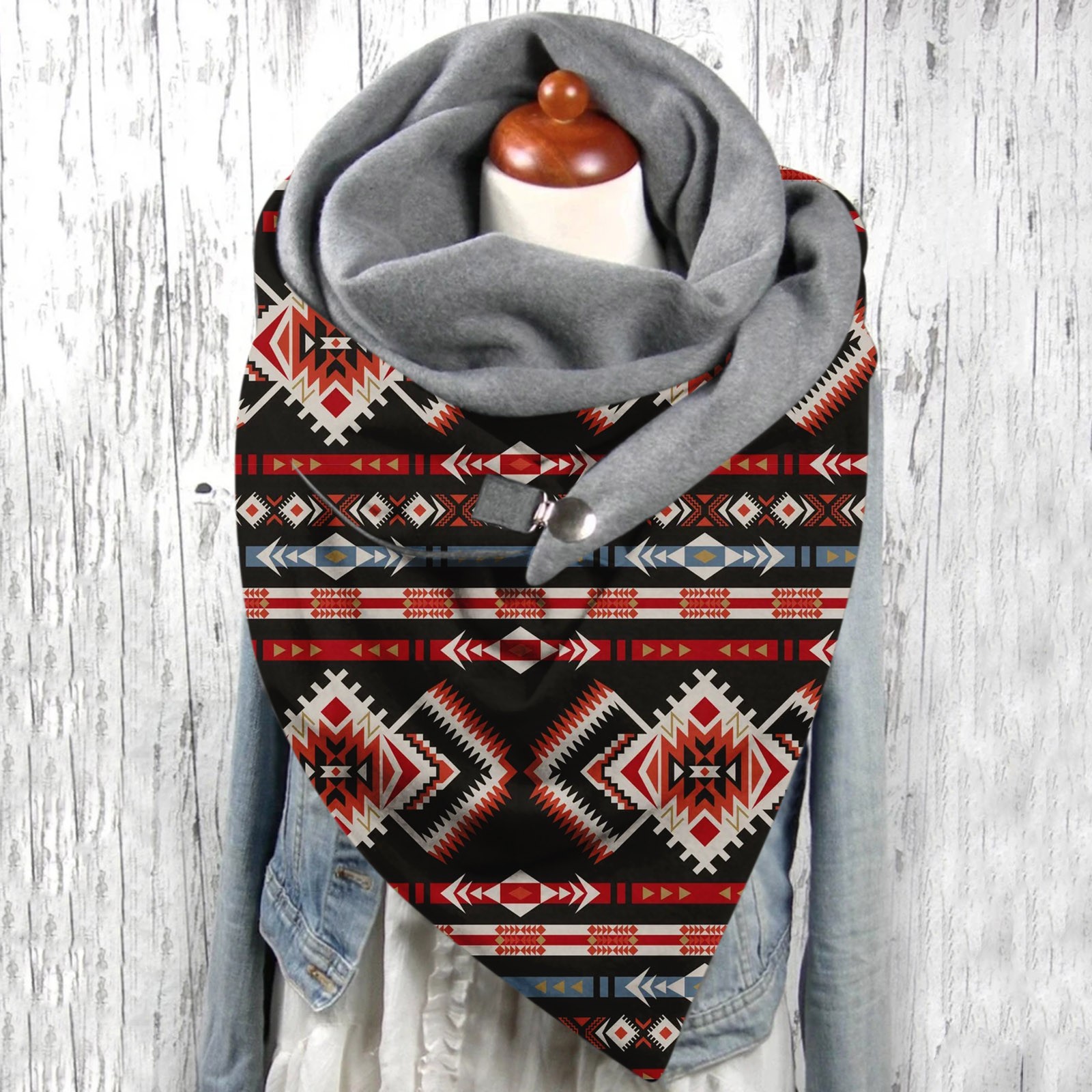 Универсальный теплый двухслойный шарф с геометрическим принтом и пряжкой на осень и зиму