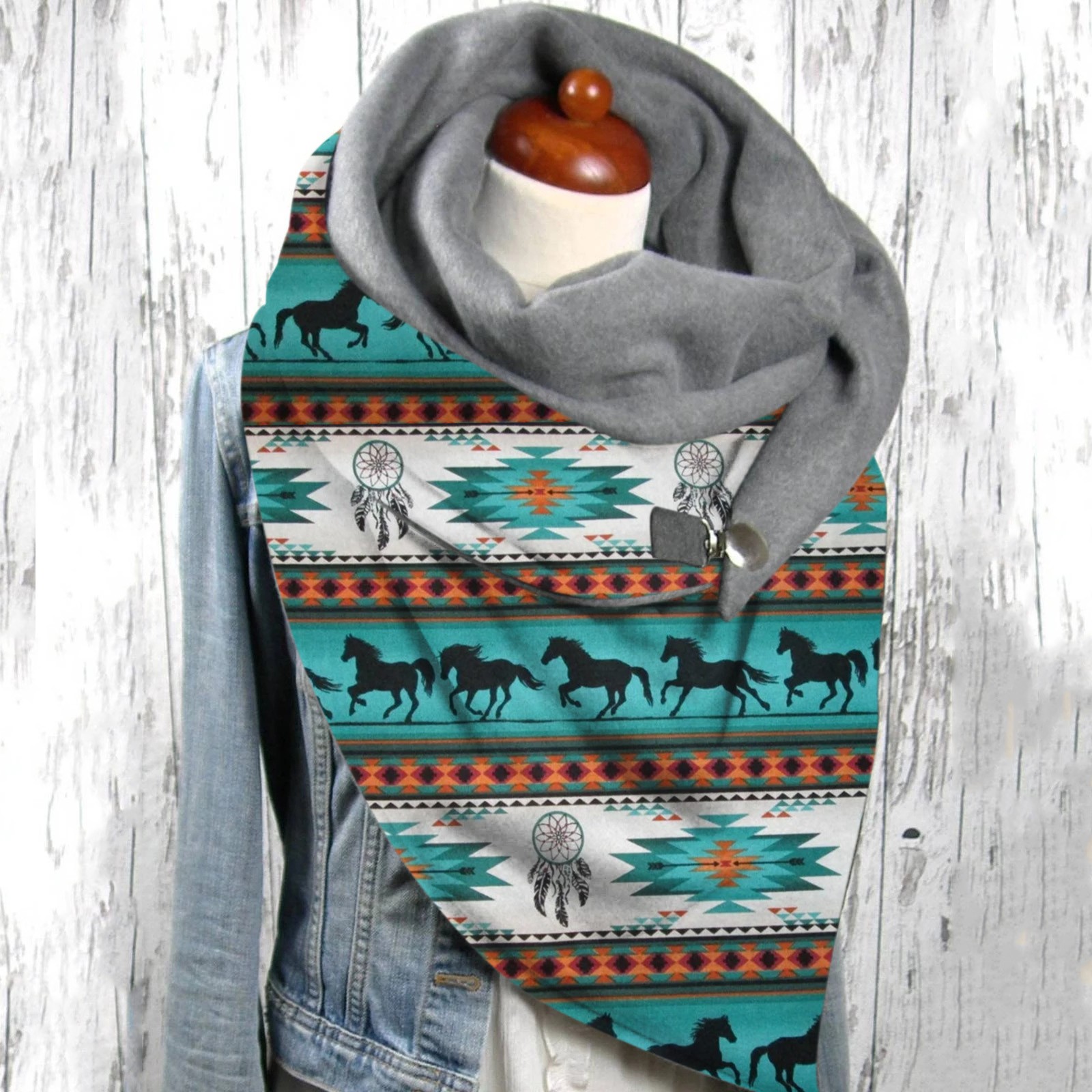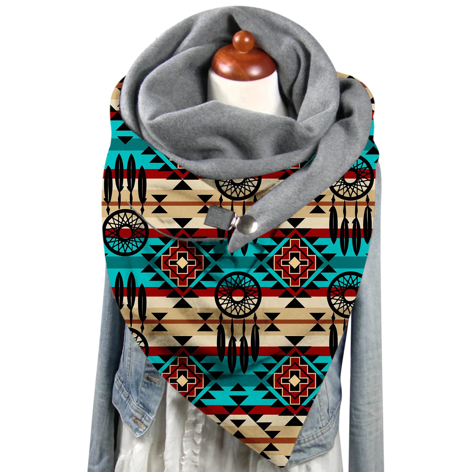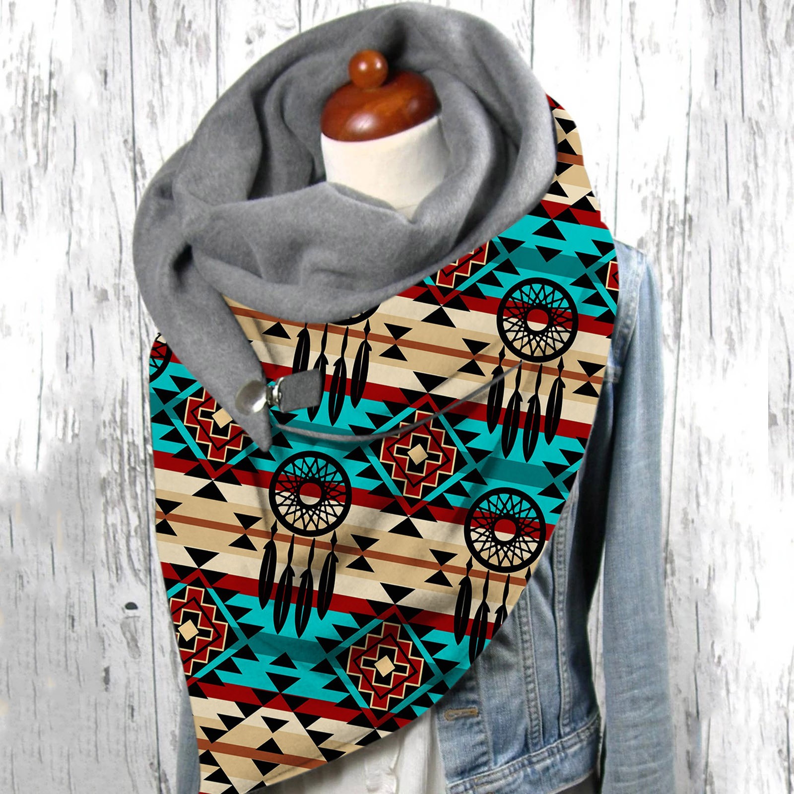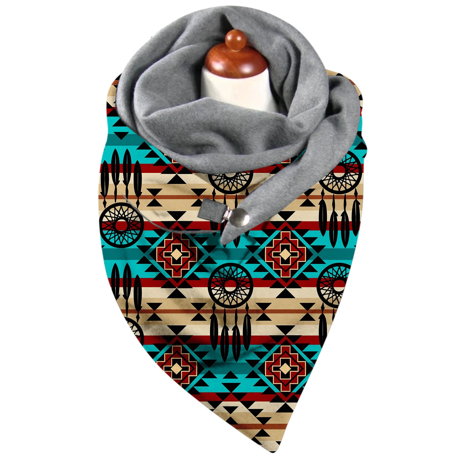 Универсальный теплый двухслойный шарф с геометрическим принтом и пряжкой на осень и зиму