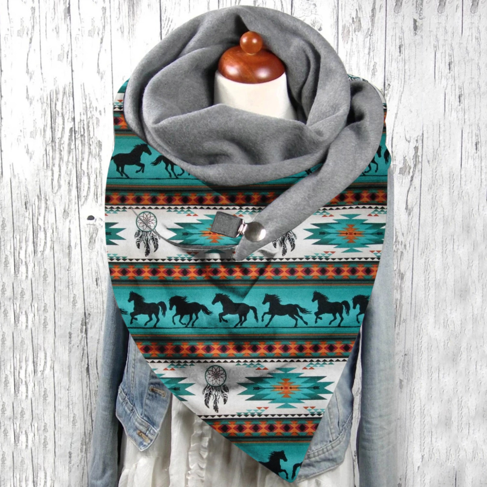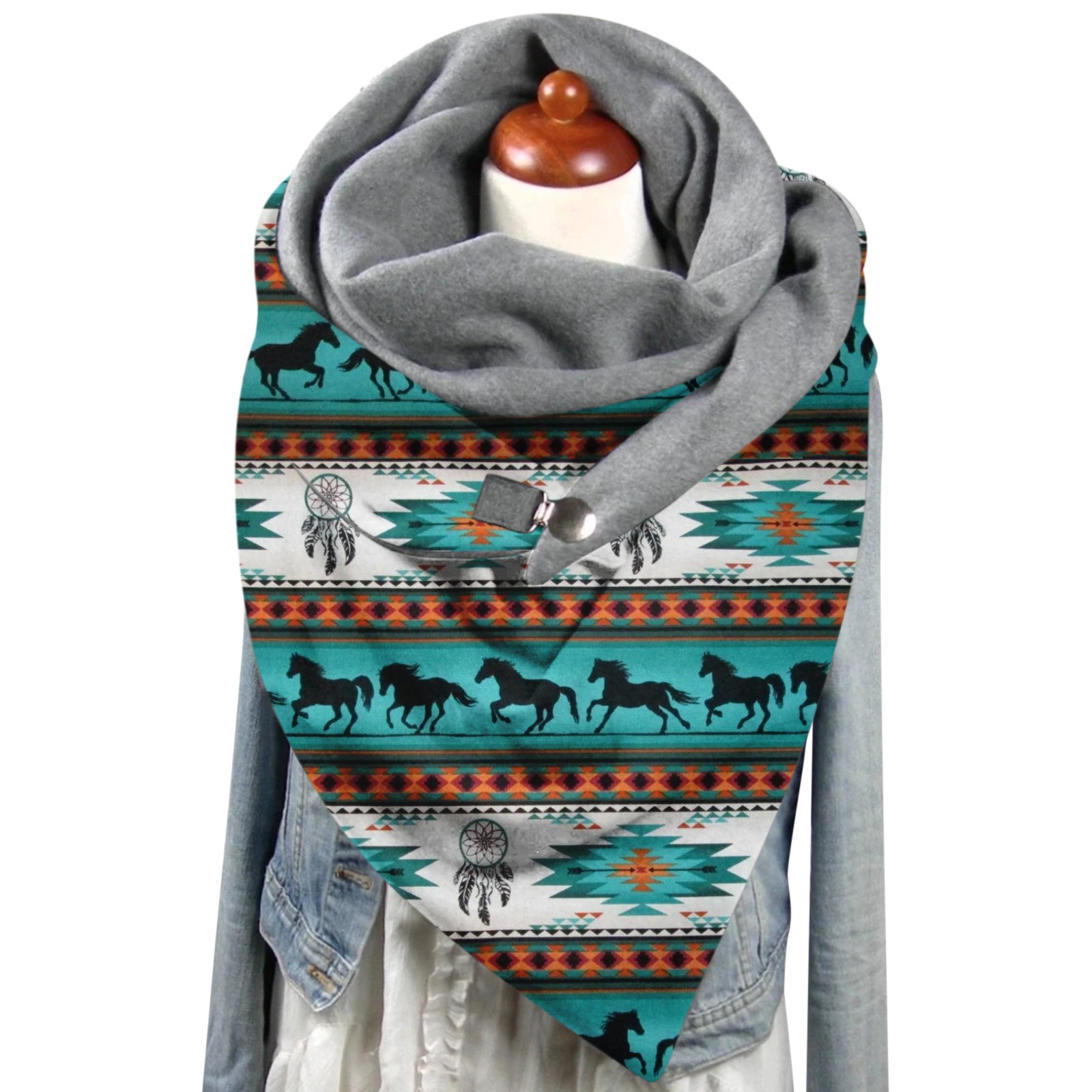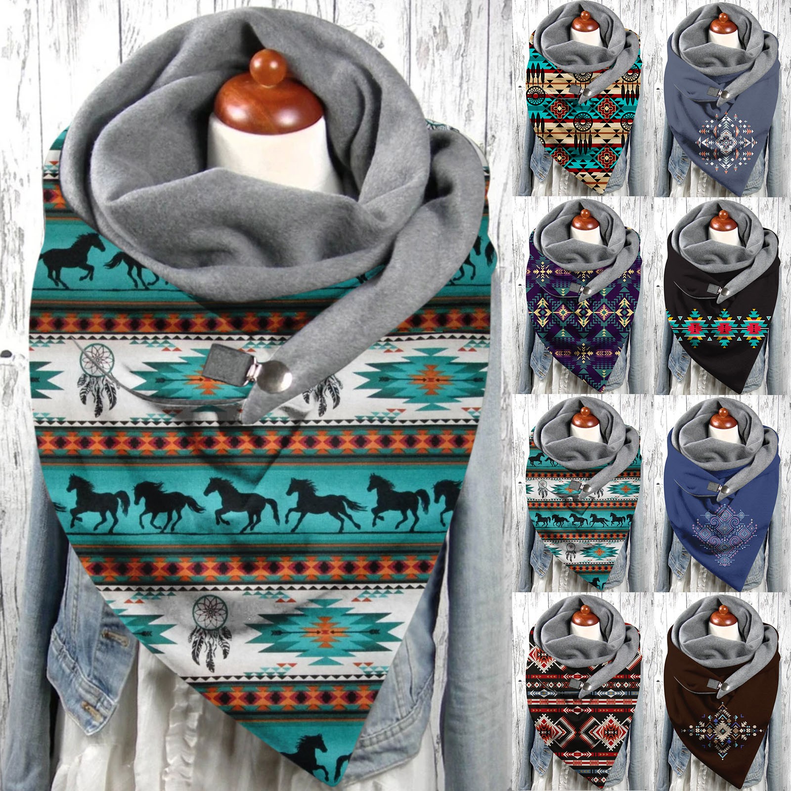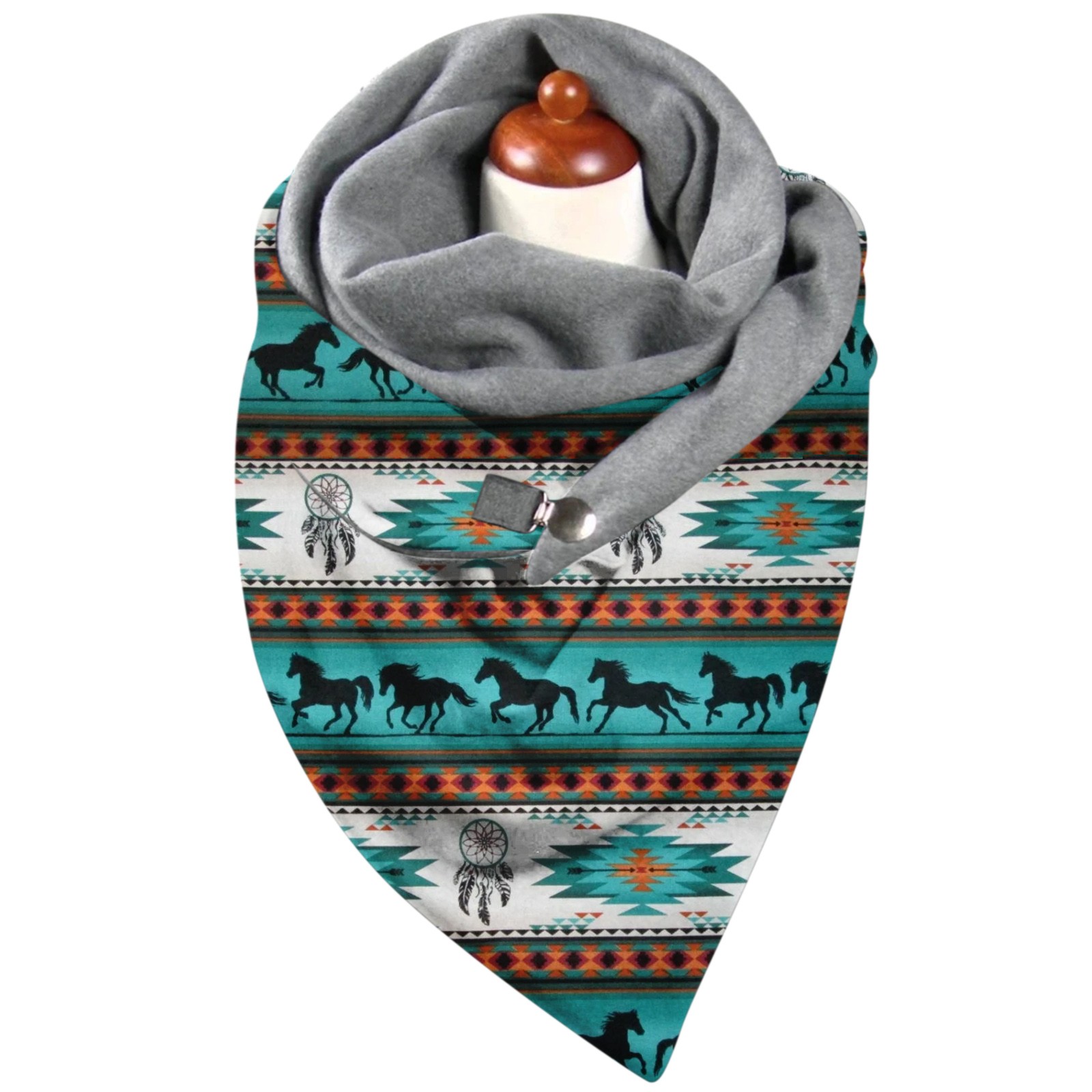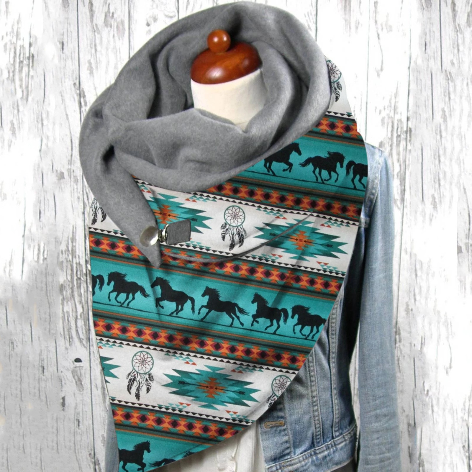 Универсальный теплый двухслойный шарф с геометрическим принтом и пряжкой на осень и зиму
