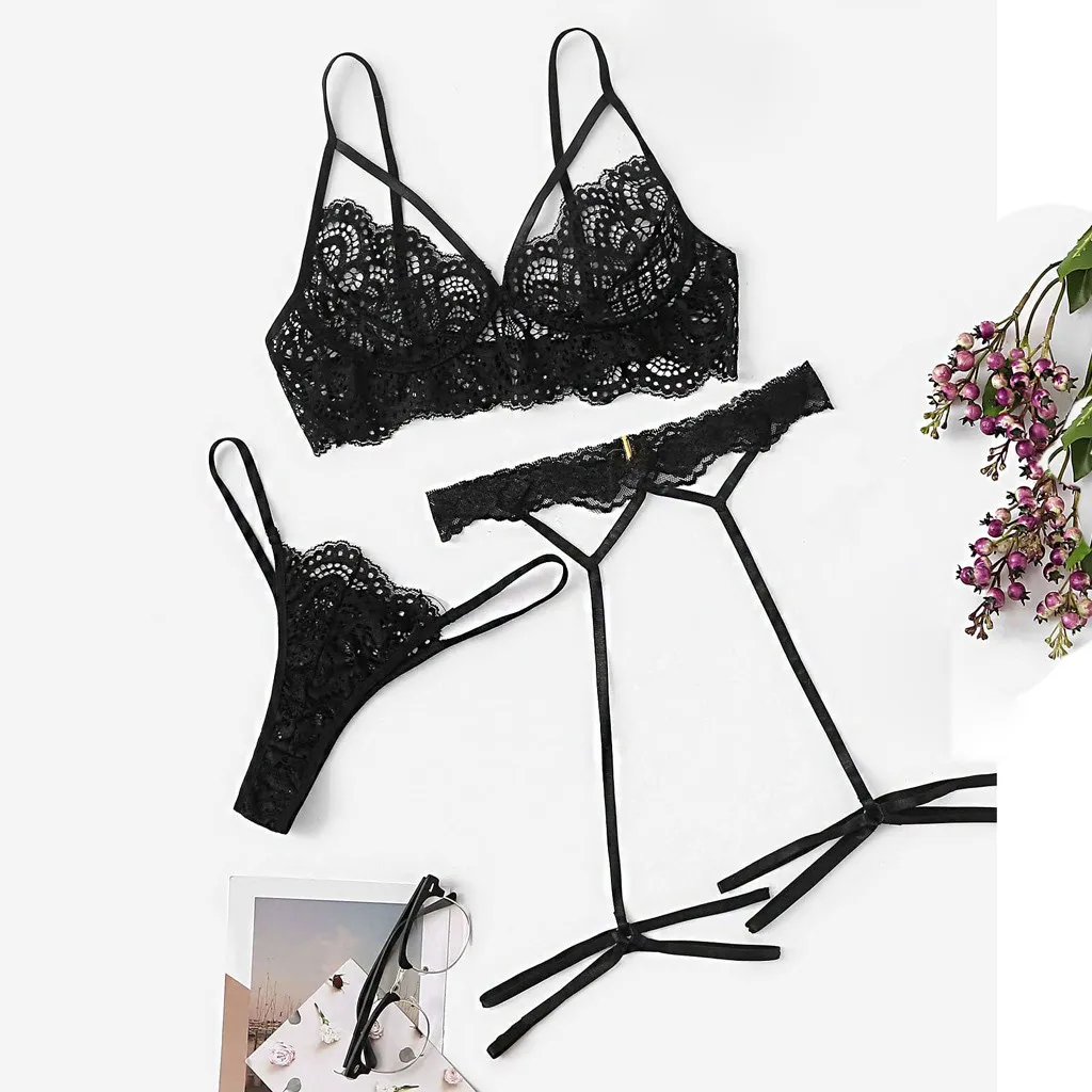 Новинка, женский сексуальный кружевной бюстгальтер, полые стринги, ночное белье с подвязками, черный комплект нижнего белья, S-XL