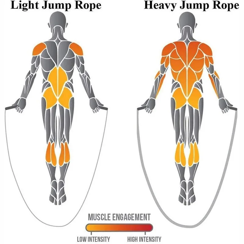 -Тяжелая Скакалка: Утяжеленная Скакалка тяжелее стандартной скакалки, она может помочь вам использовать больше энергии и нарастить мышцы.