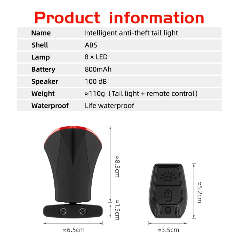 Комплектация: 1 * задний фонарь, 1 * пульт дистанционного управления, 1 * база, 1 * фиксированный силиконовый ремешок, 1 * фиксированный кронштейн, 1 * коробка.