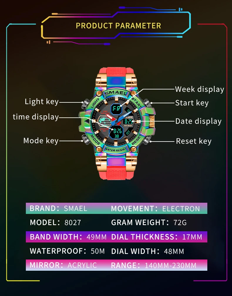 1. Бренд: SMAEL2. Двойные часы отображаются вместе с включением задней LED-подсветки3. Водонепроницаемость до 50 м4. Тип: мужские наручные часы для занятий спортом5. Механизм: оригинальная японская цифровая индикация6. 7 видов цветов на выбор8. Ширина ремешка: (около) 2.2 см9. Диаметр циферблата: (приблизительно) 4,8 см10. Материал ремешка: прочный ПУ11. Материал корпуса: прочная резина + высокопрочное закаленное стекло12. Застежка: пряжка13. Показывают точное время14. Прекрасный подарок для кого-то особенногоПримечание: Мы рекомендуем вам не носить его во время плавания. Если вы плаваете или ныряете с часами, пожалуйста, не нажимайте никаких кнопок под водой!Включенные компоненты:-1 x Оригинальныенаручные часы отSMAEL-1 х Инструкция по эксплуатации