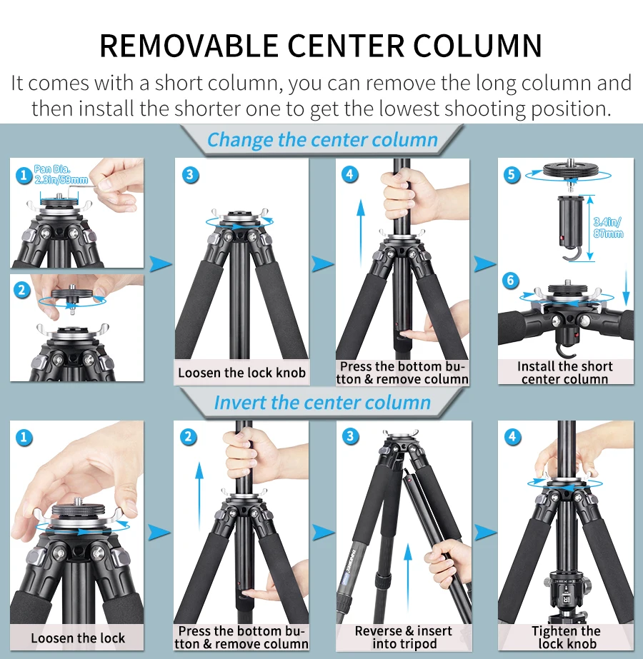 【Низкое положение и Макросъемка 】длинная специальная центральная колонка может быть перевернута, чтобы взять mAcro фото, кроме того, он поставляется с более короткая центральная колонка, после установки, вы можете получить самую низкую высотой 18 см/19,5 см. Все три ножки могут быть отрегулированы под тремя углами (8 °/36 °/66 °), вы можете получить более подходящую высоту, выложив пряжку.