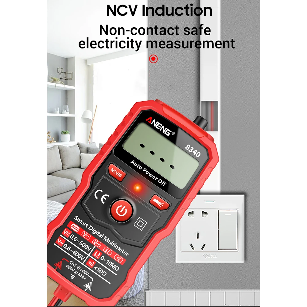 [Индукция NCV] приближает часть NCV к измеренному объекту, при обнаружении рядом напряжения переменного тока красный светодиодный светильник будет мигать, и звуковой сигнал будет звучать, чтобы указать.