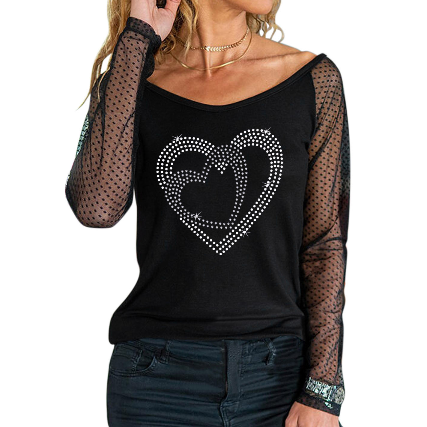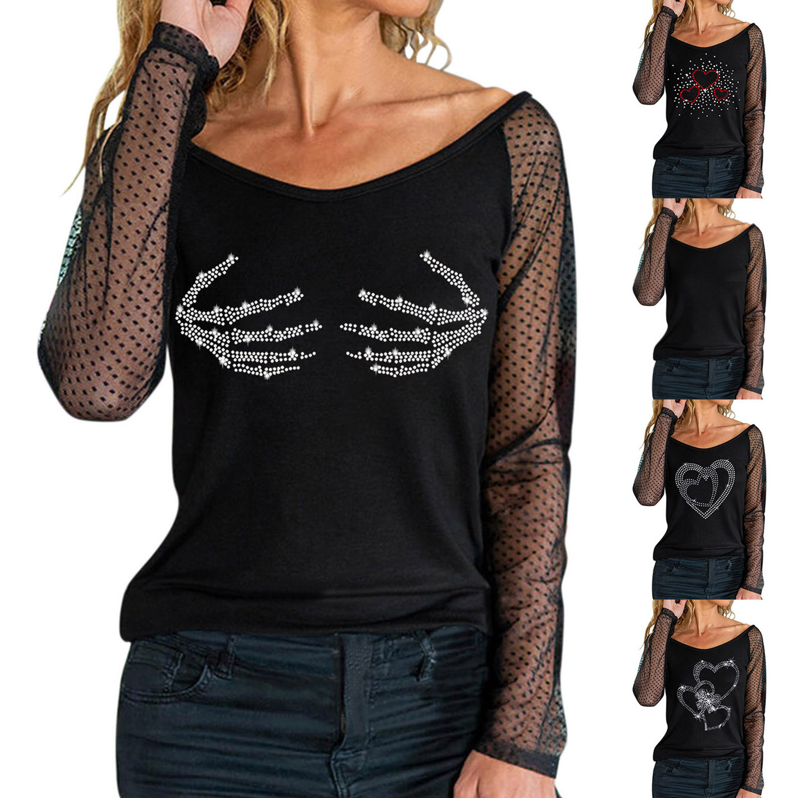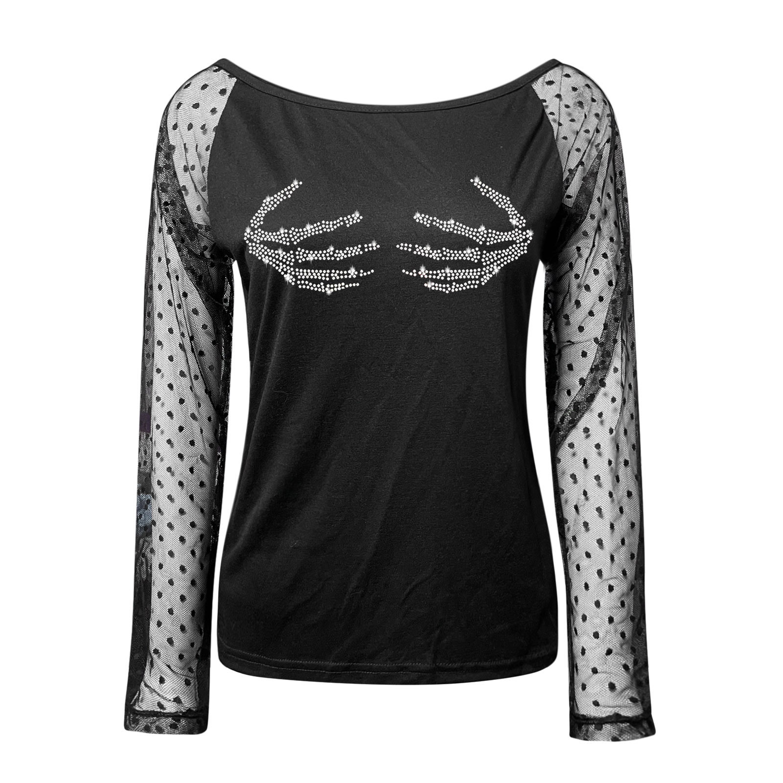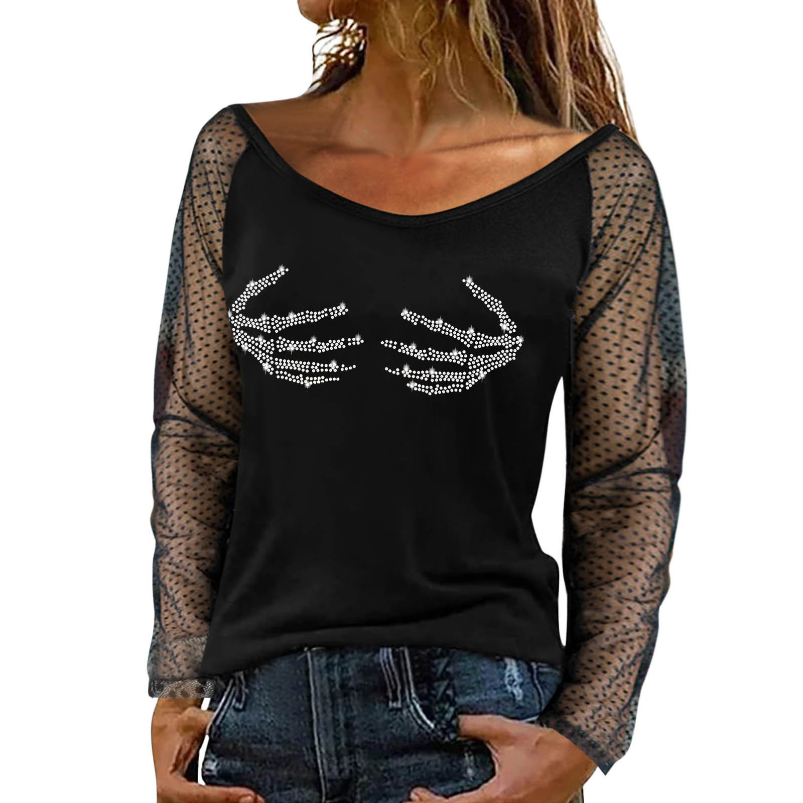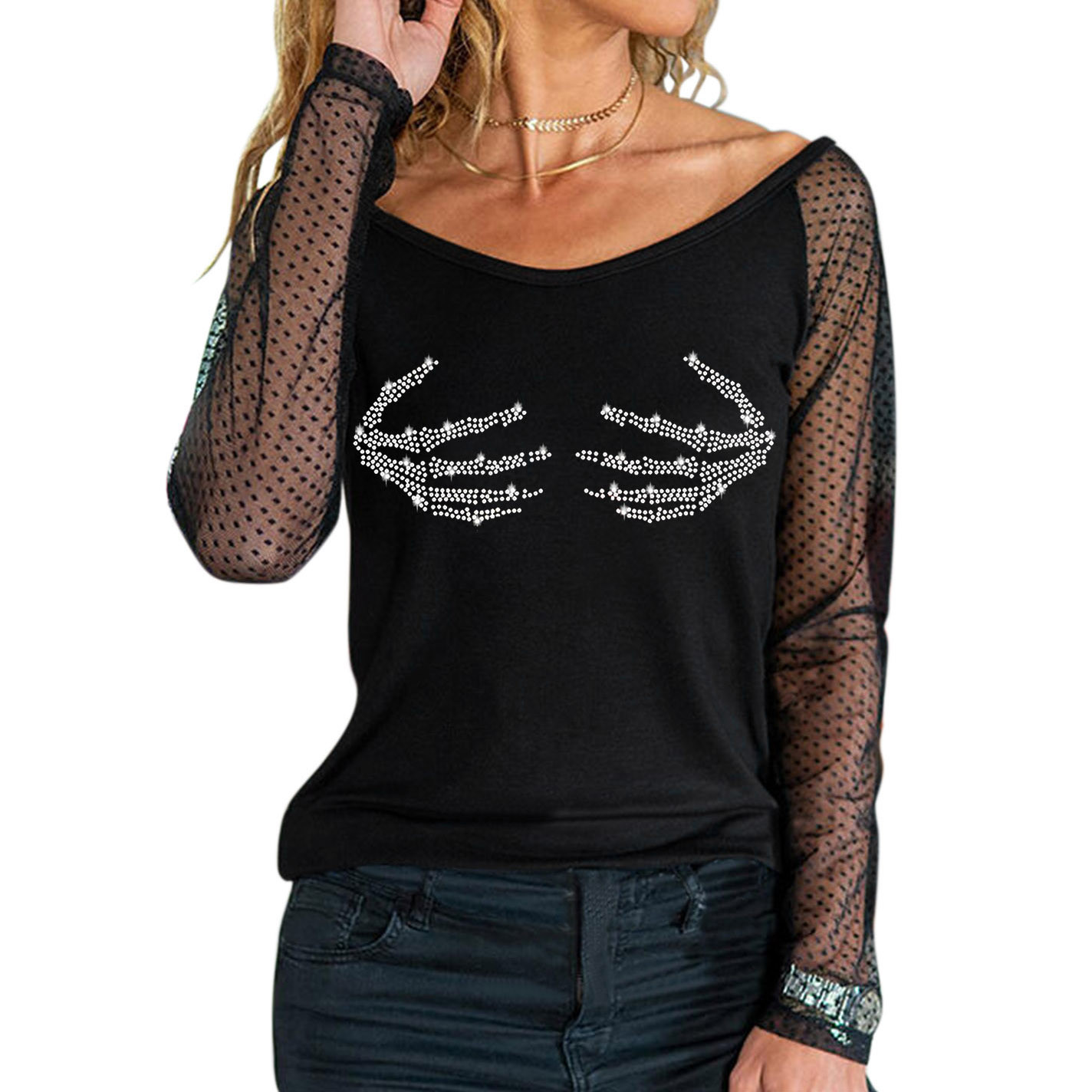 Для женщин Легкий пуловер, сексуальный топ с длинными рукавами и стразами Топ с вырезом; Сезон осень-зима; Повседневная одежда; Вечерние Блузы на бретелях