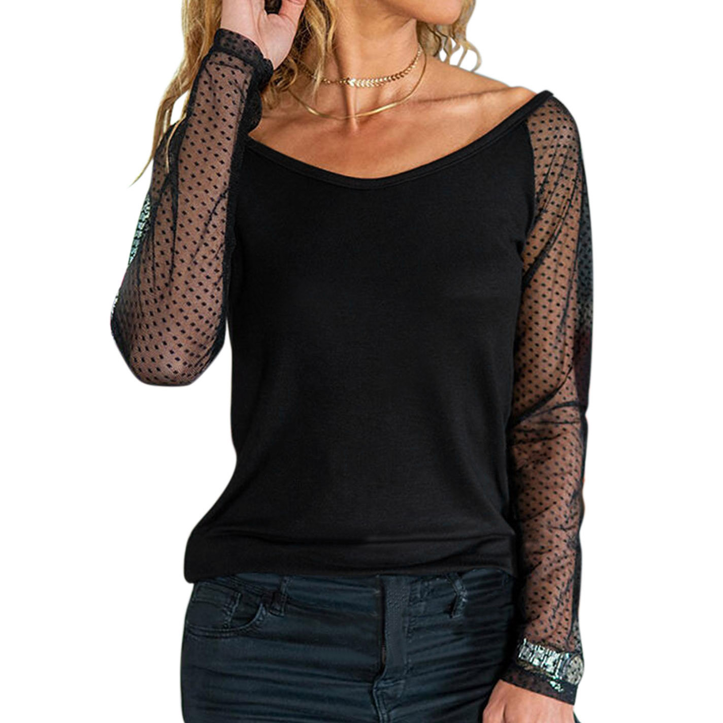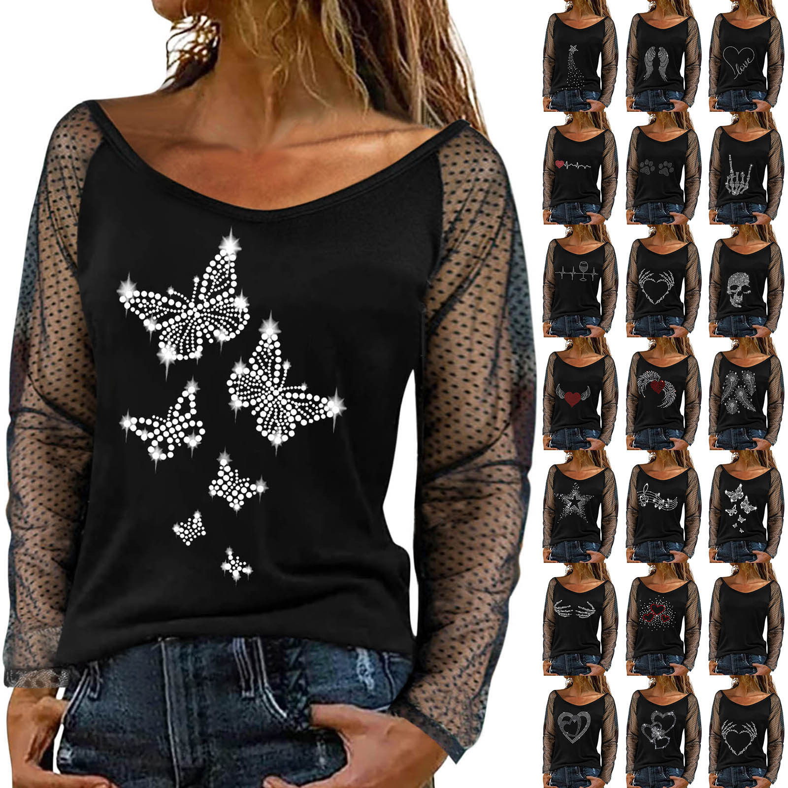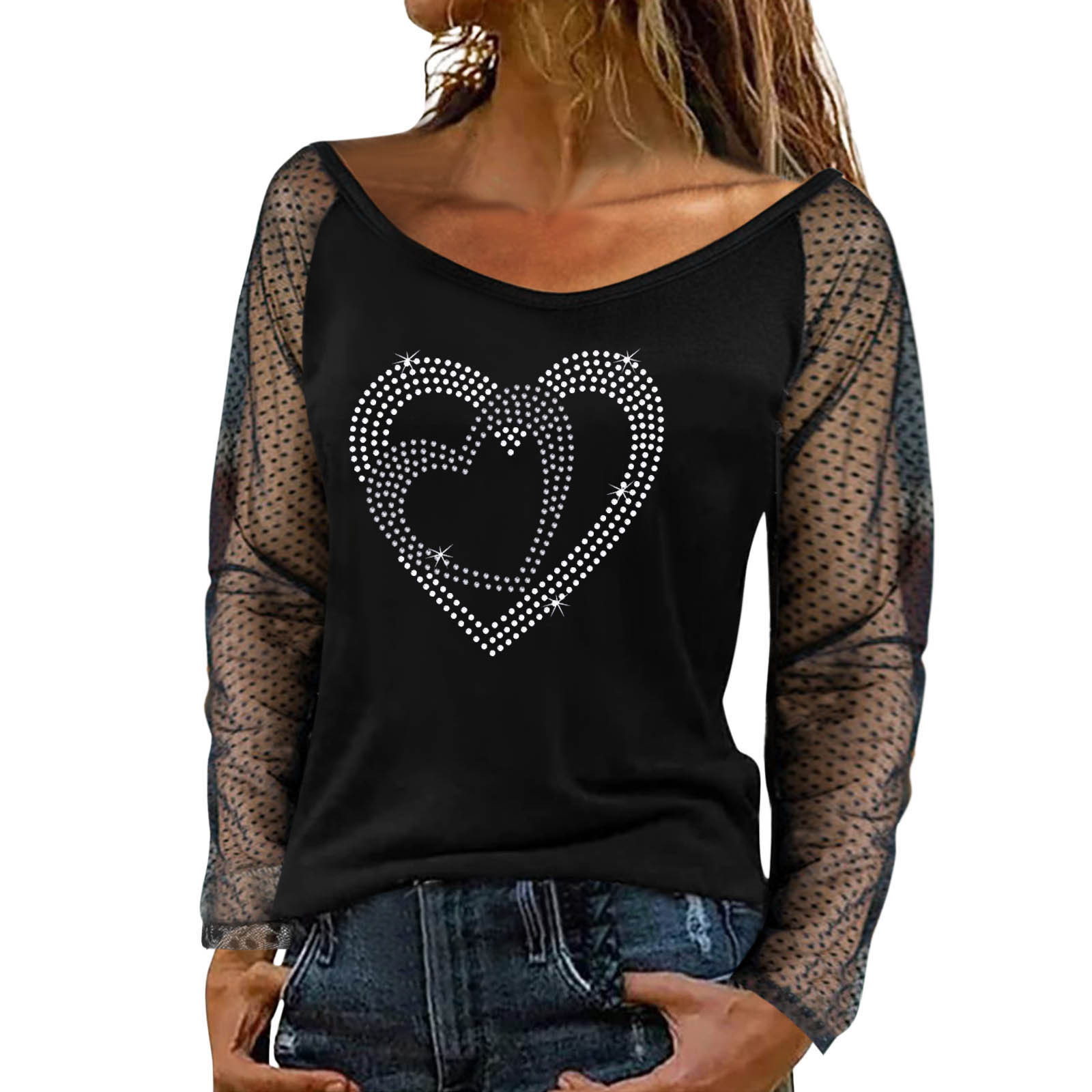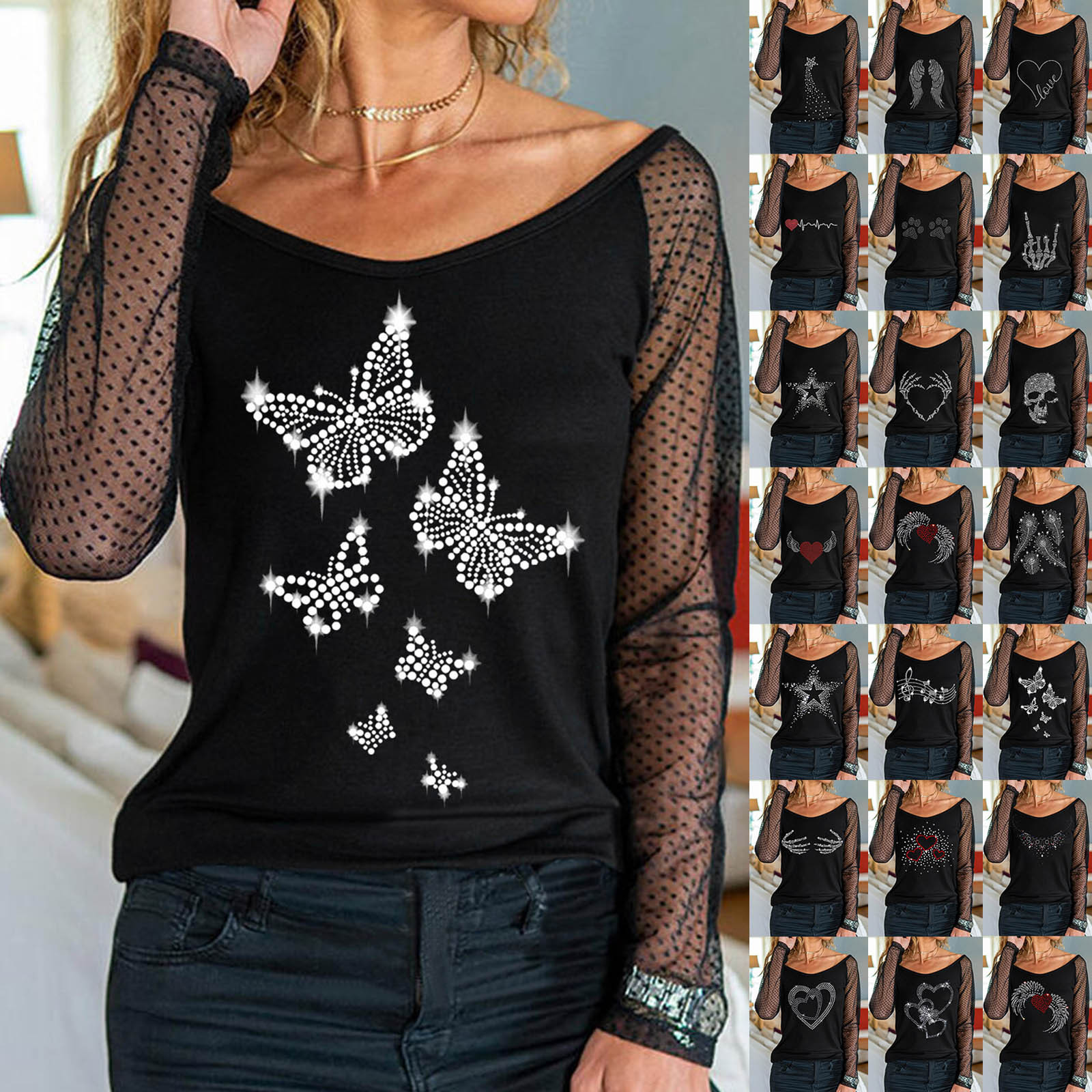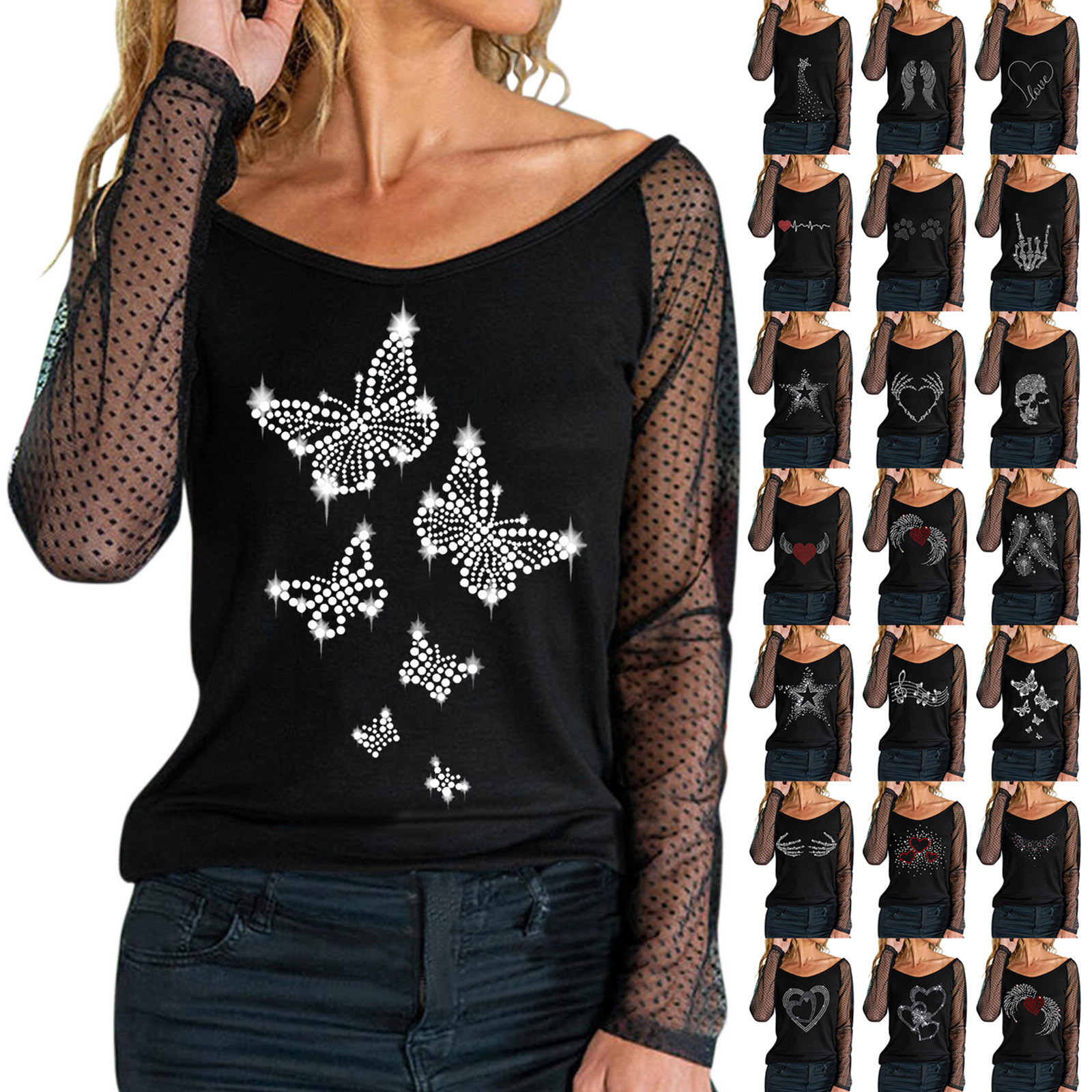 Для женщин Легкий пуловер, сексуальный топ с длинными рукавами и стразами Топ с вырезом; Сезон осень-зима; Повседневная одежда; Вечерние Блузы на бретелях