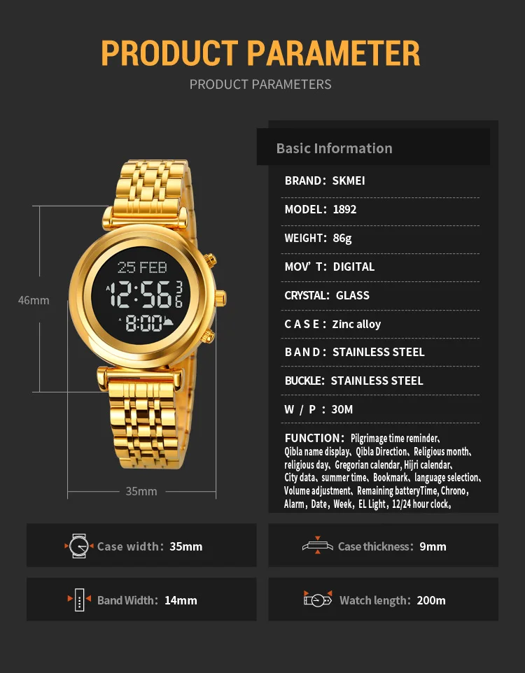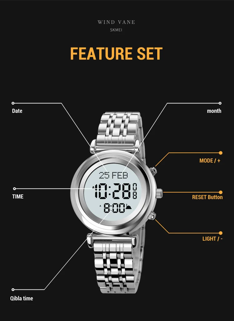 8.Function: pilgrimage time reminder, Qibla name display, Qibla direction, Religious month, religious day, gregorian calendar, Hijri calendar, city data, summer time, bookmark, language selection, volume adjustment, remaining battery time, chrono, alarm, date, week, EL light, 12/24 hour clock