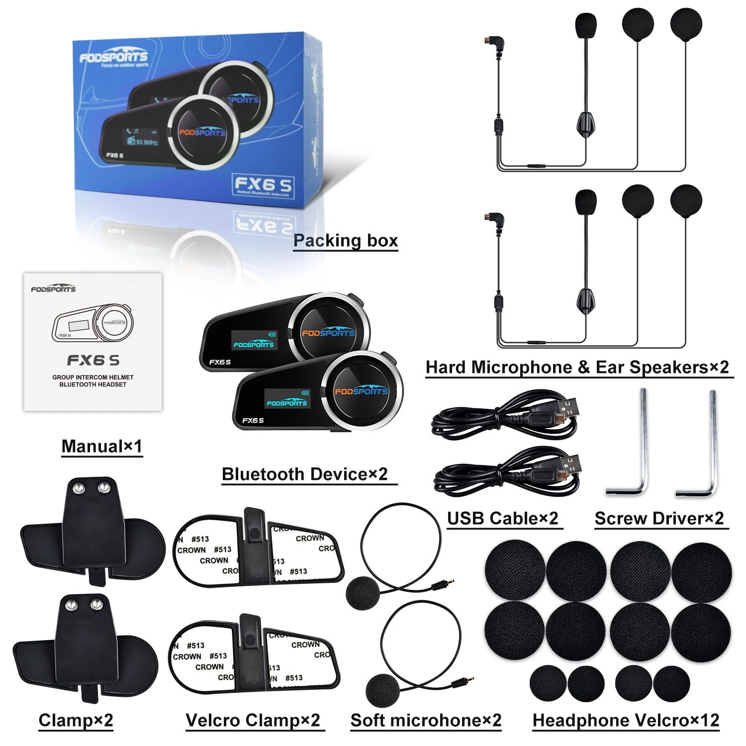 Package include2*FX6 S Intercom2*Earphone with hard microphone2*Soft microphone2*Clip & Screw1*Screw Driver2*Charging USB cable1*User Manual