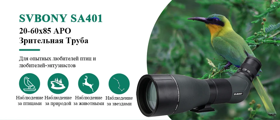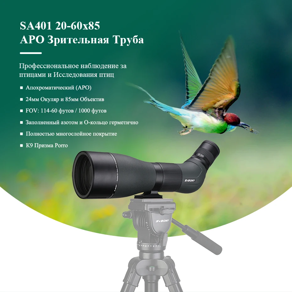 1. Зрительная труба SA401 APO предназначена для птиц. Профессиональная оптическая система APO обеспечивает исключительное разрешение, сокращает хроматическую аберрацию и обеспечивает отличную цветопередачу, резкость от края до края и светильник.