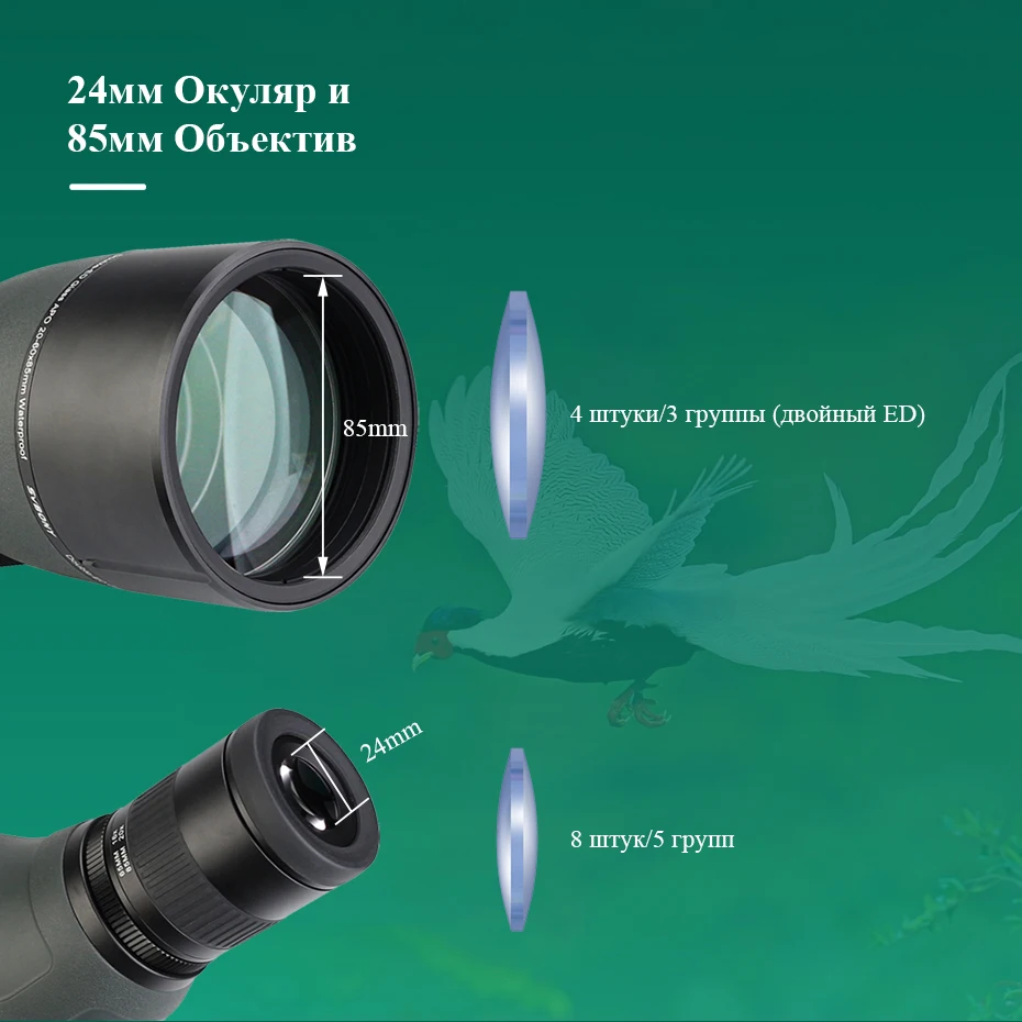 Большой объектив диаметром 85 мм (4 штуки / 3 группы) собирает больше света для более яркого обзора и обеспечивает приятное наблюдение, особенно в условиях низкой освещенности, таких как сумерки или рассвет, а также отлично подходит для наблюдения за ночным небом. 24-миллиметровый окуляр (8 штук / 5 групп) вызывает меньшее напряжение глаз при наблюдении.