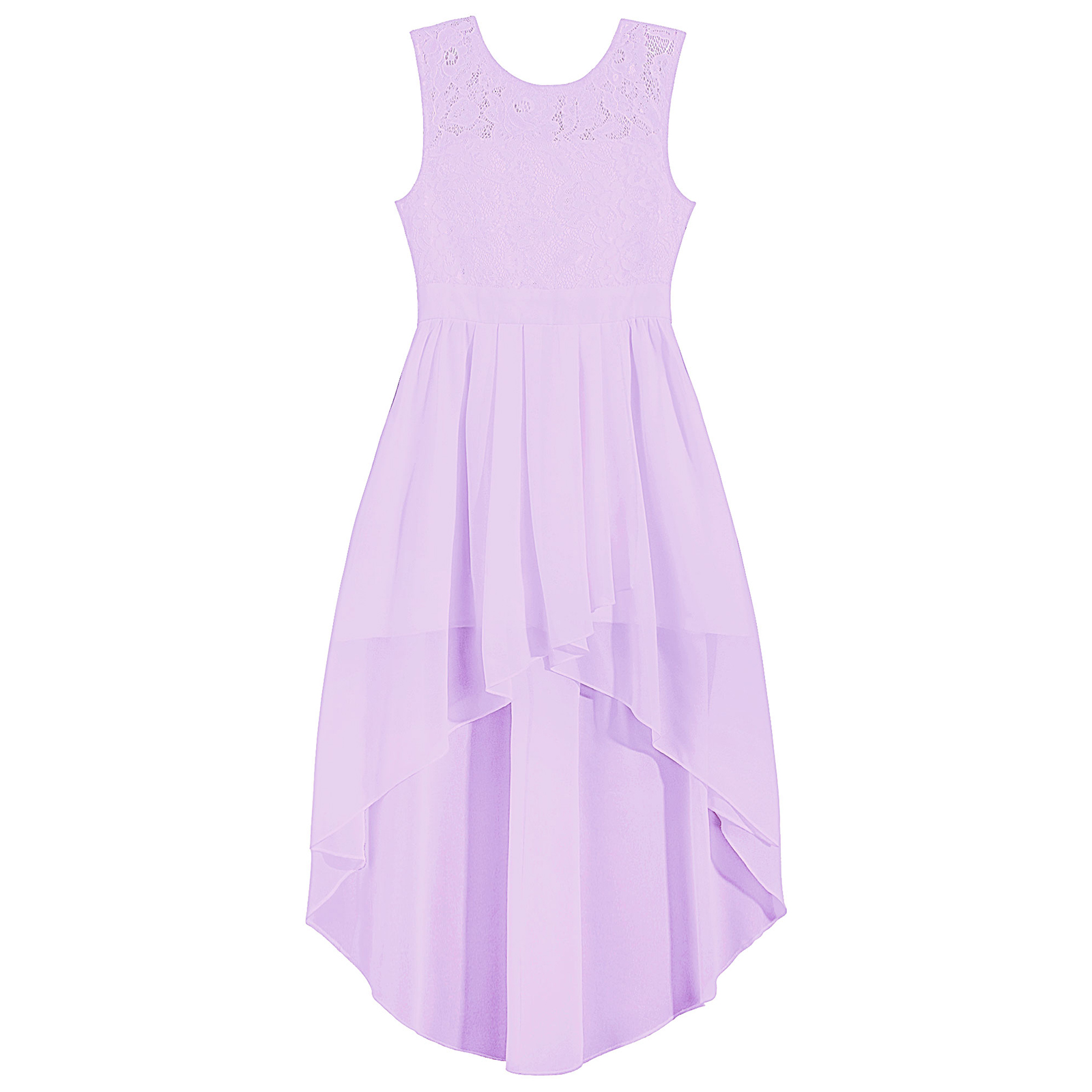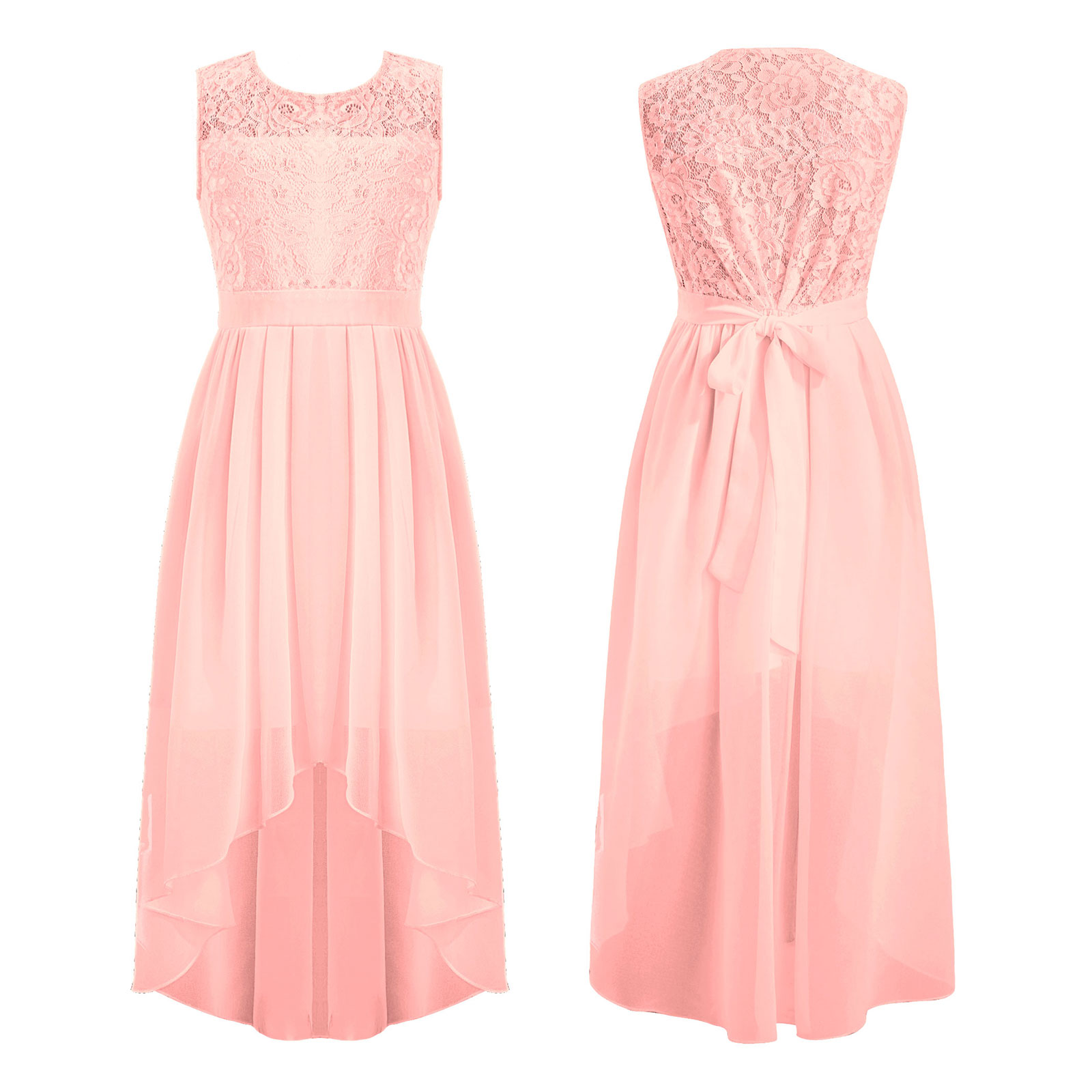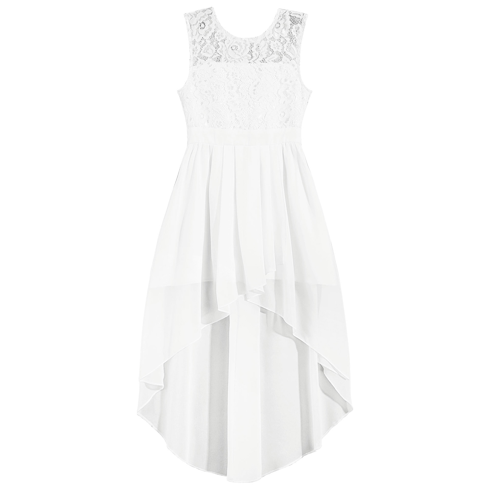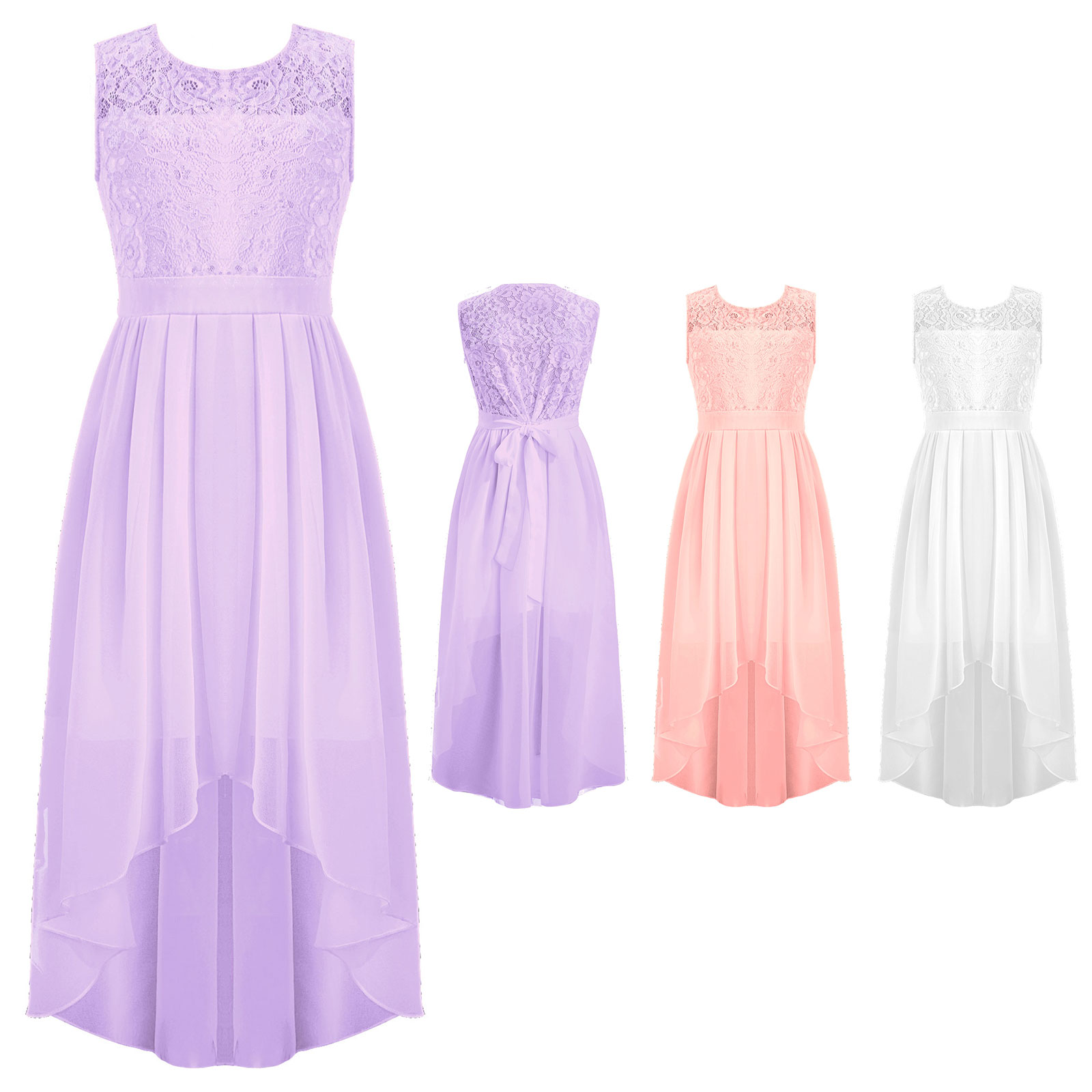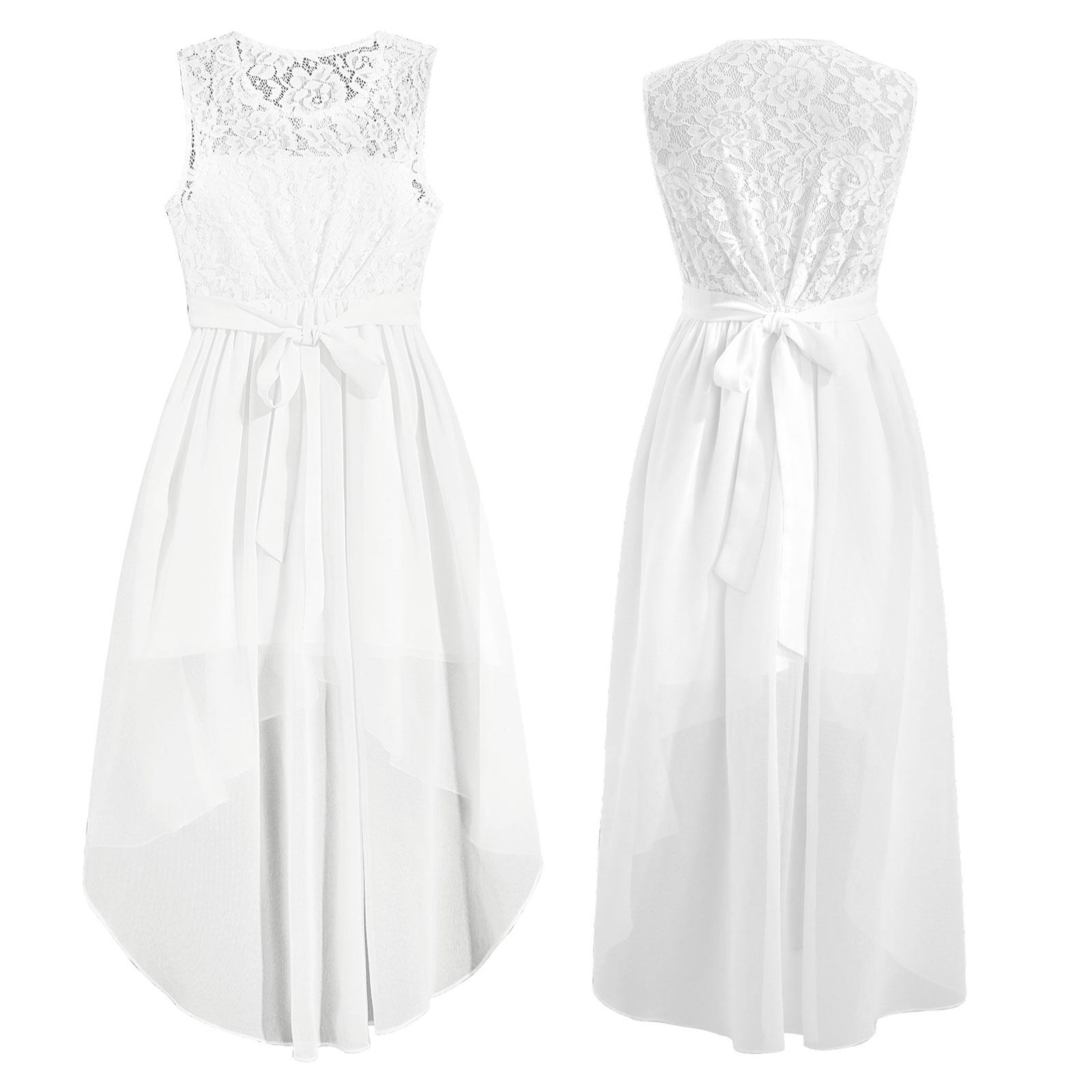 Детское элегантное кружевное шифоновое платье с цветочным рисунком для девочек; Асимметричное платье без рукавов с круглым вырезом и низким подолом для свадьбы, дня рождения.
