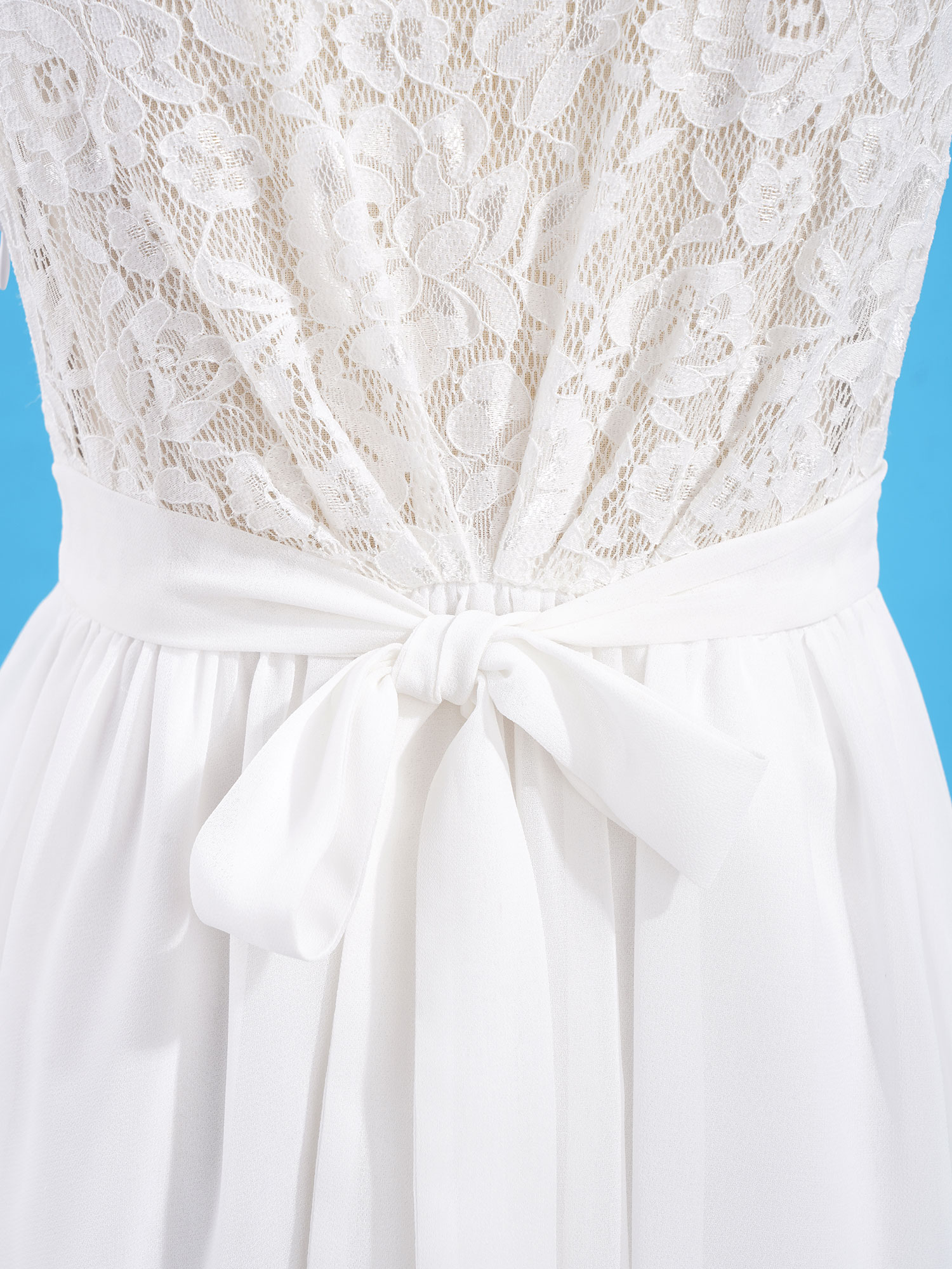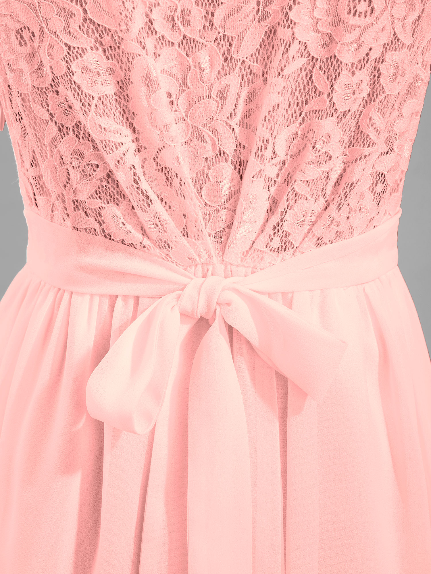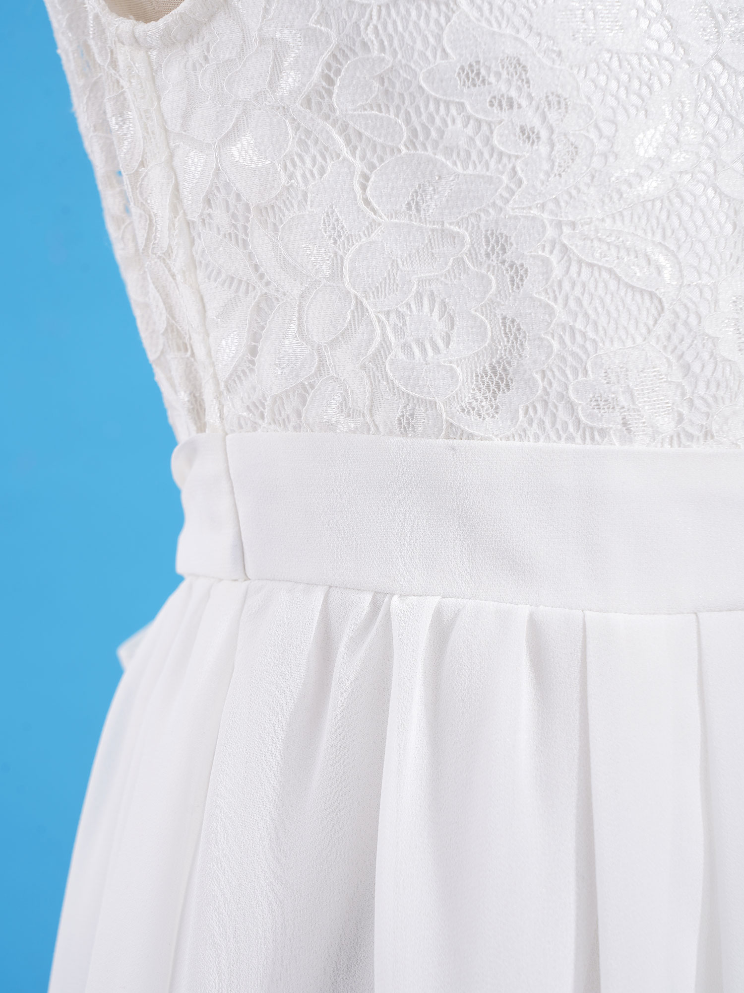 Это элегантное платье с круглым вырезом, без рукавов, цветочным кружевом сверху, асимметричным шифоновым подолом, боковой застежкой-молнией и поясом сзади.