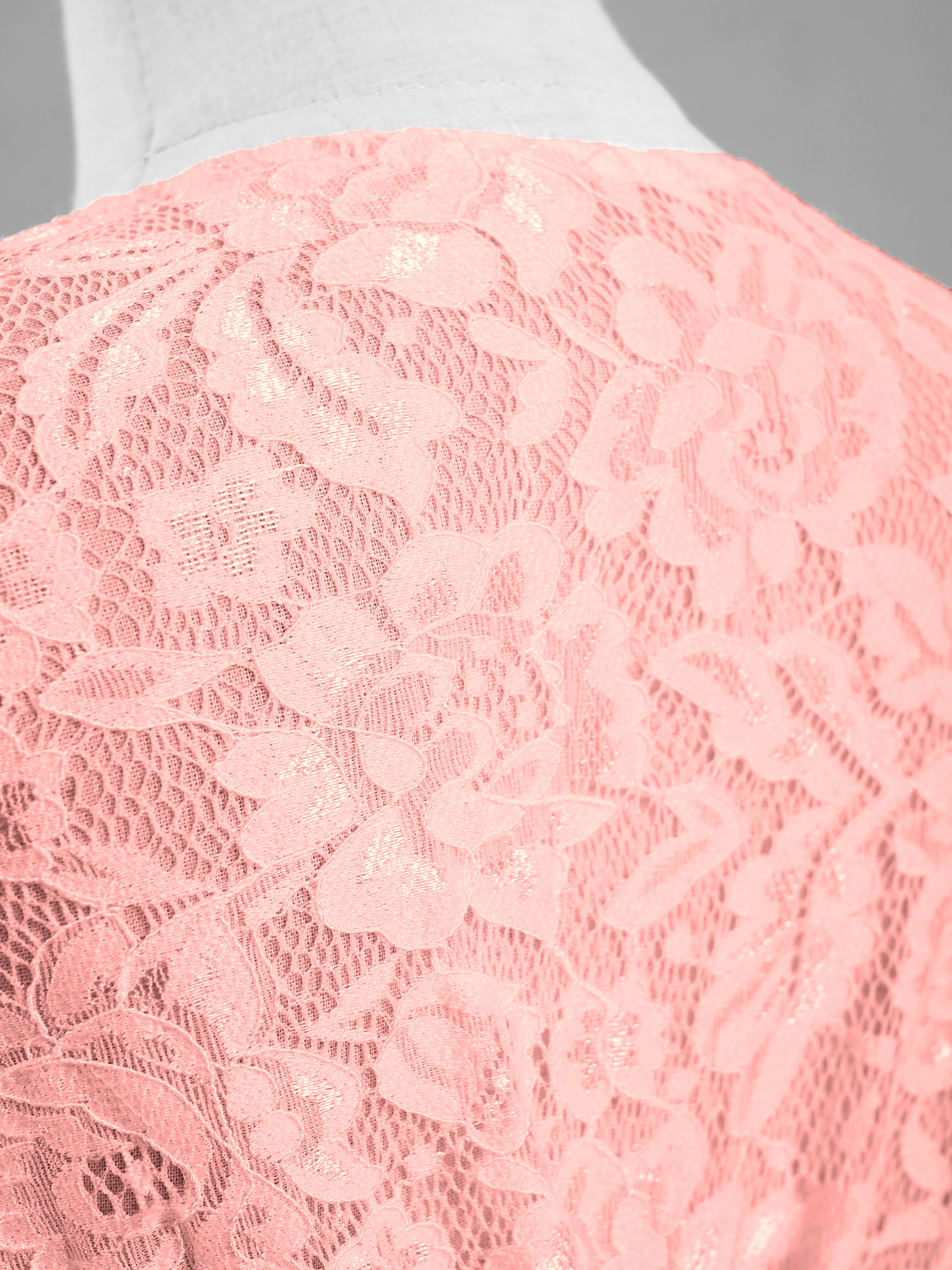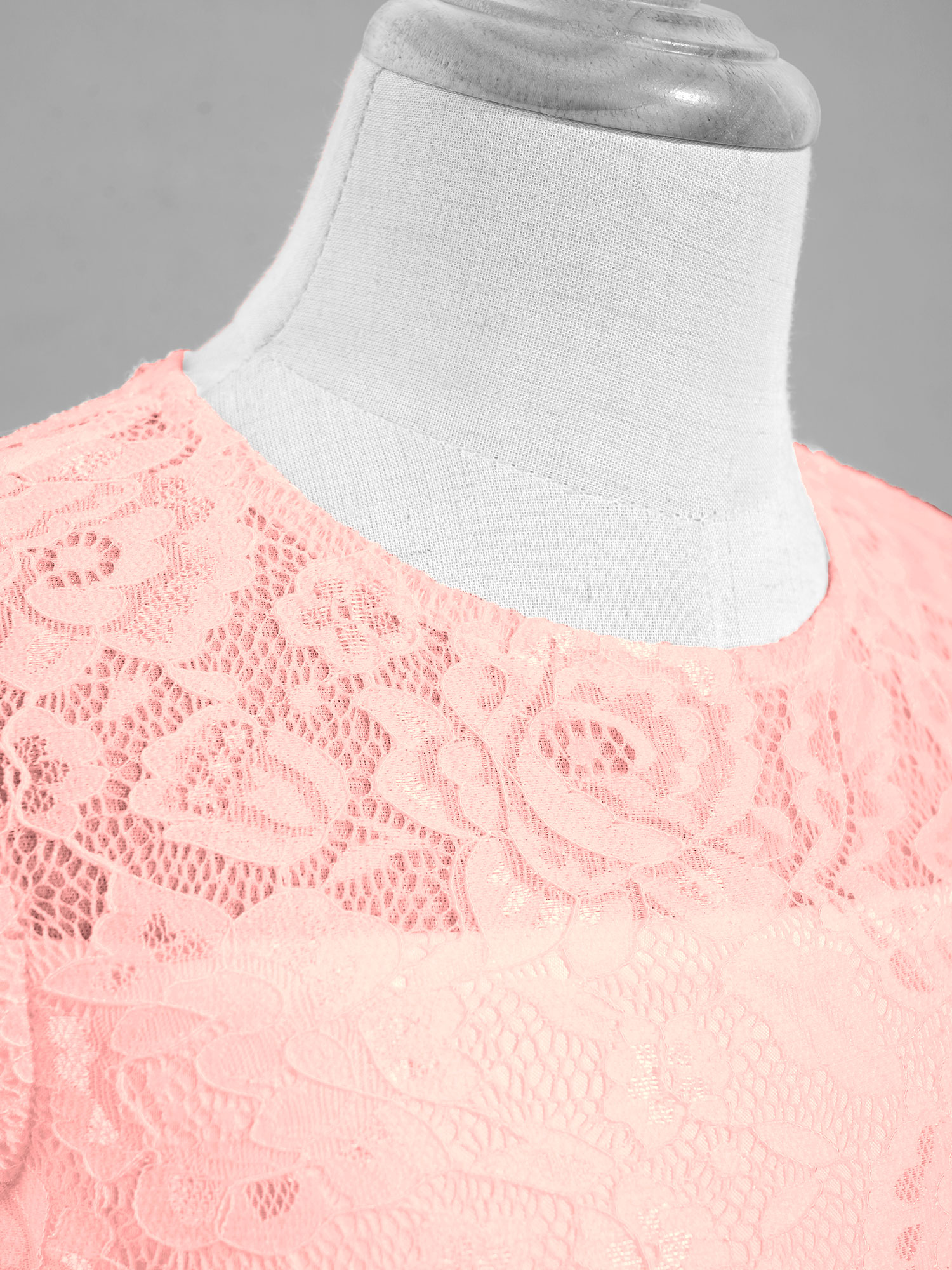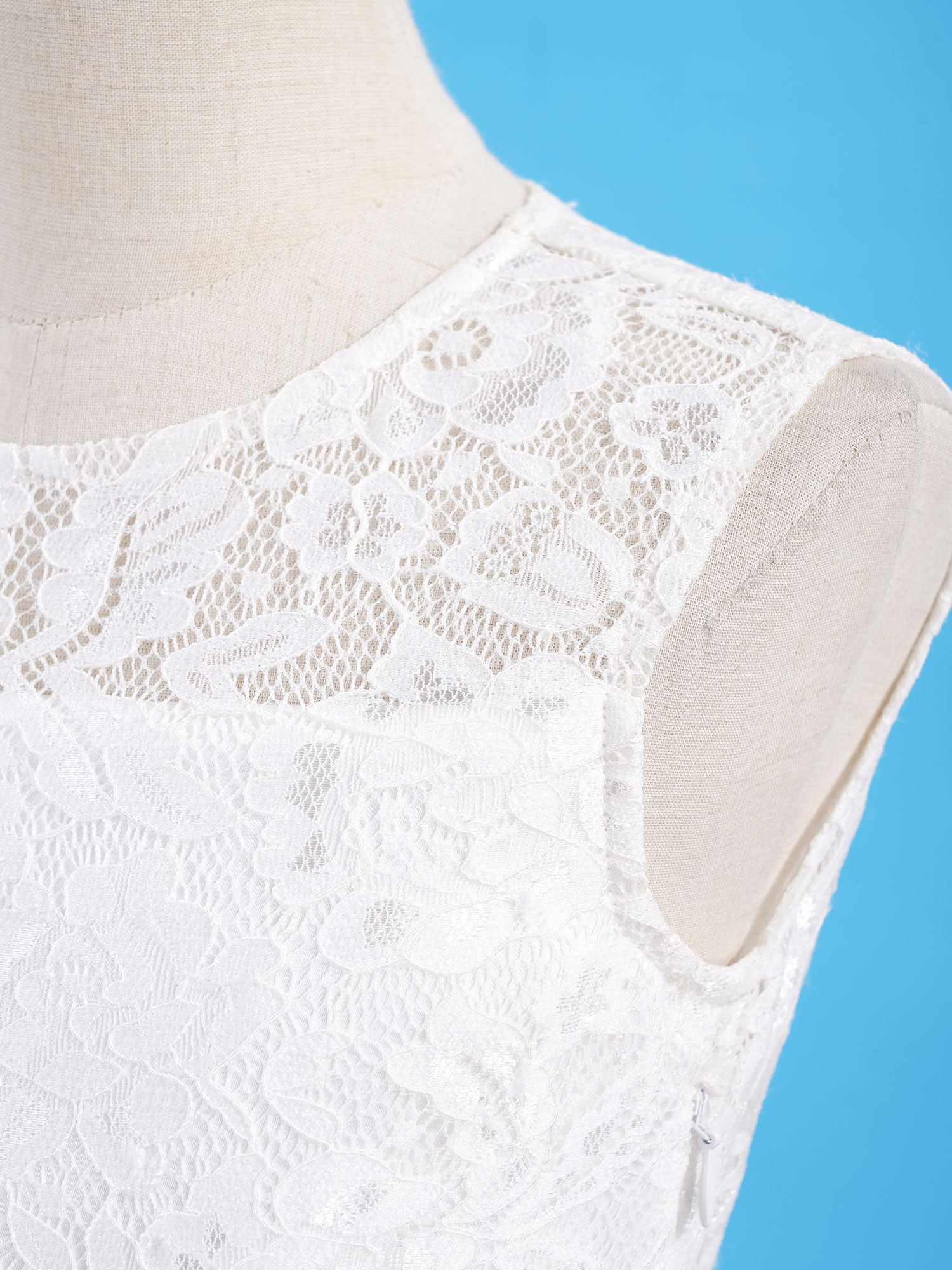 Это элегантное платье с круглым вырезом, без рукавов, цветочным кружевом сверху, асимметричным шифоновым подолом, боковой застежкой-молнией и поясом сзади.