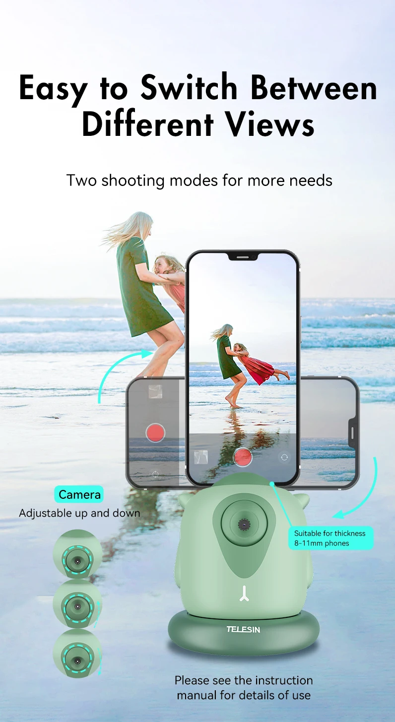 6. Съемка под разными углами, переключение между вертикальными и горизонтальными экранами по желанию. Зажим можно регулировать на 10 ° вверх и 20 ° вниз, подходит для телефонов толщиной 8-11 мм.
