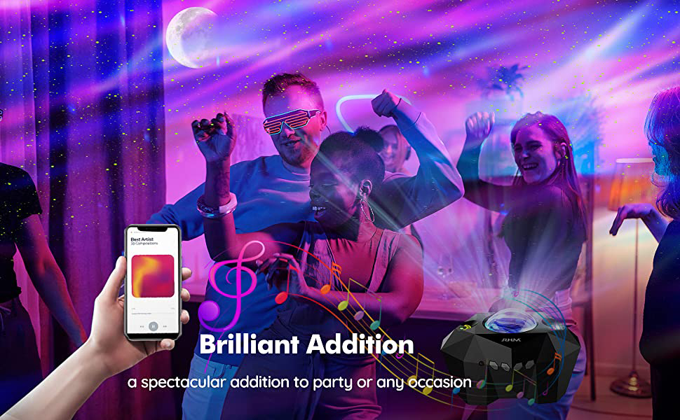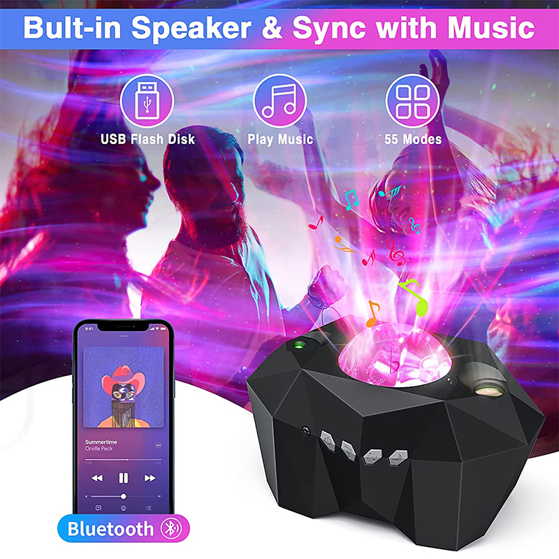 Этот проектор Nebula Galaxy имеет встроенный микро-bluetooth 5,2 музыкальный динамик и разъем USB. Он может воспроизводить музыку с проектора туманности и расслаблять и медитировать музыку во время просмотра туманности Авроры ночью, создавая романтическую и успокаивающую атмосферу.
