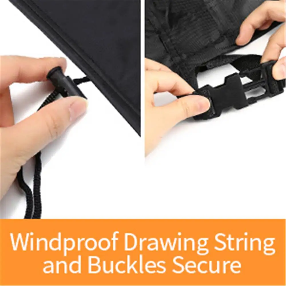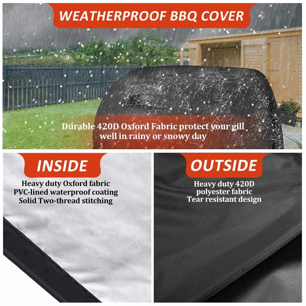 【Windproof】Крышка для гриля не будет выдуваться ветром. Мы добавили что-то липкое с обеих сторон и регулируемую термоусадочную веревку на нижней части крышки для барбекю, даже используется в плохую погоду, сохраняя гриль сухим и безопасным.