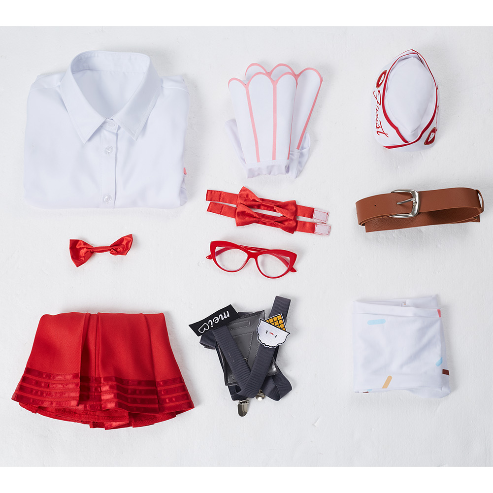 В комплекте: рубашка + юбка + перчатки + шапка + ремешок на спине + очки + галстук-бабочка * 2 + пояс + колготки