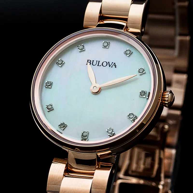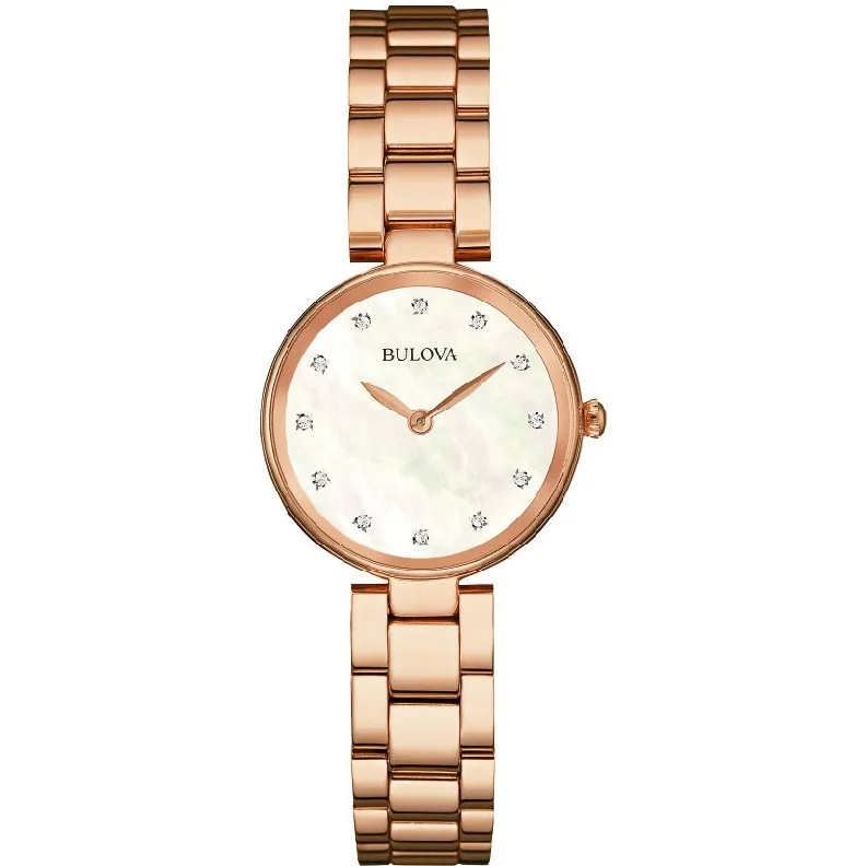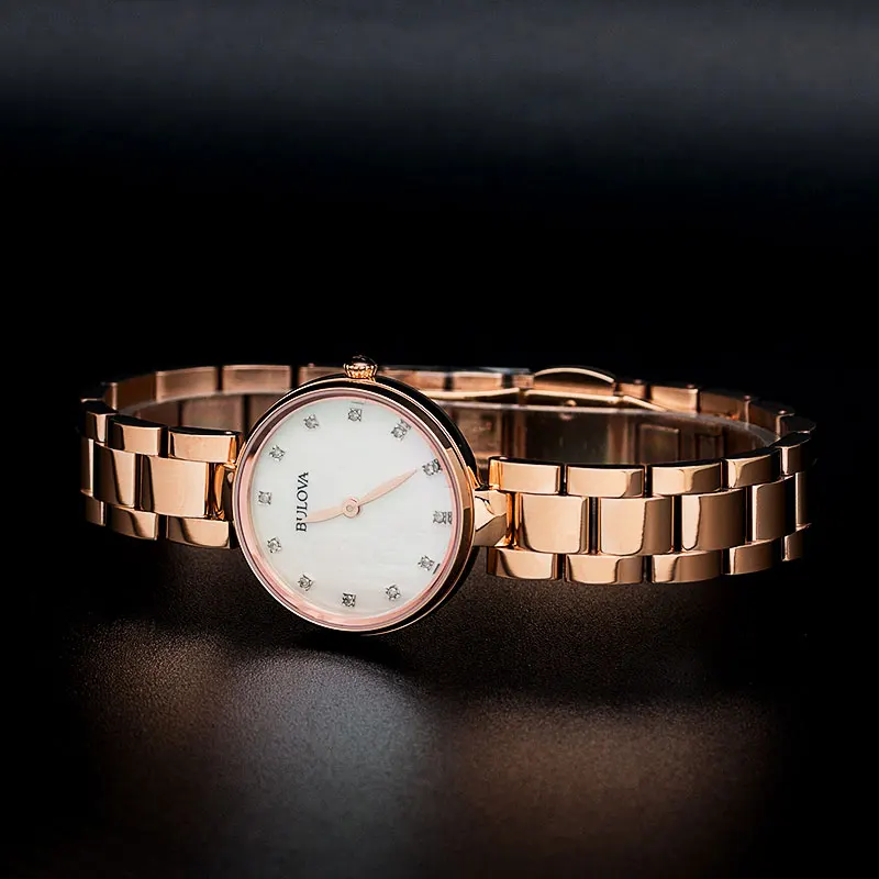 Кварцевые часы. Корпус и браслет выполнены из нержавеющей стали с IPRG покрытием. Сапфировое стекло. Перламутровый циферблат. Бриллианты. Диаметр 27мм. Водозащита 30м.