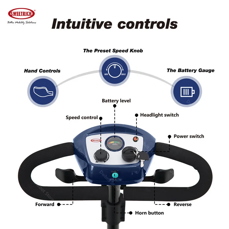 1. Сильная мощность --- оснащен мотором 24 В x 300 Вт, который прочнее и обеспечивает более быструю скорость-4,97 mph и более высокий угол скалолазания-8 градусов, чем у конкурентов