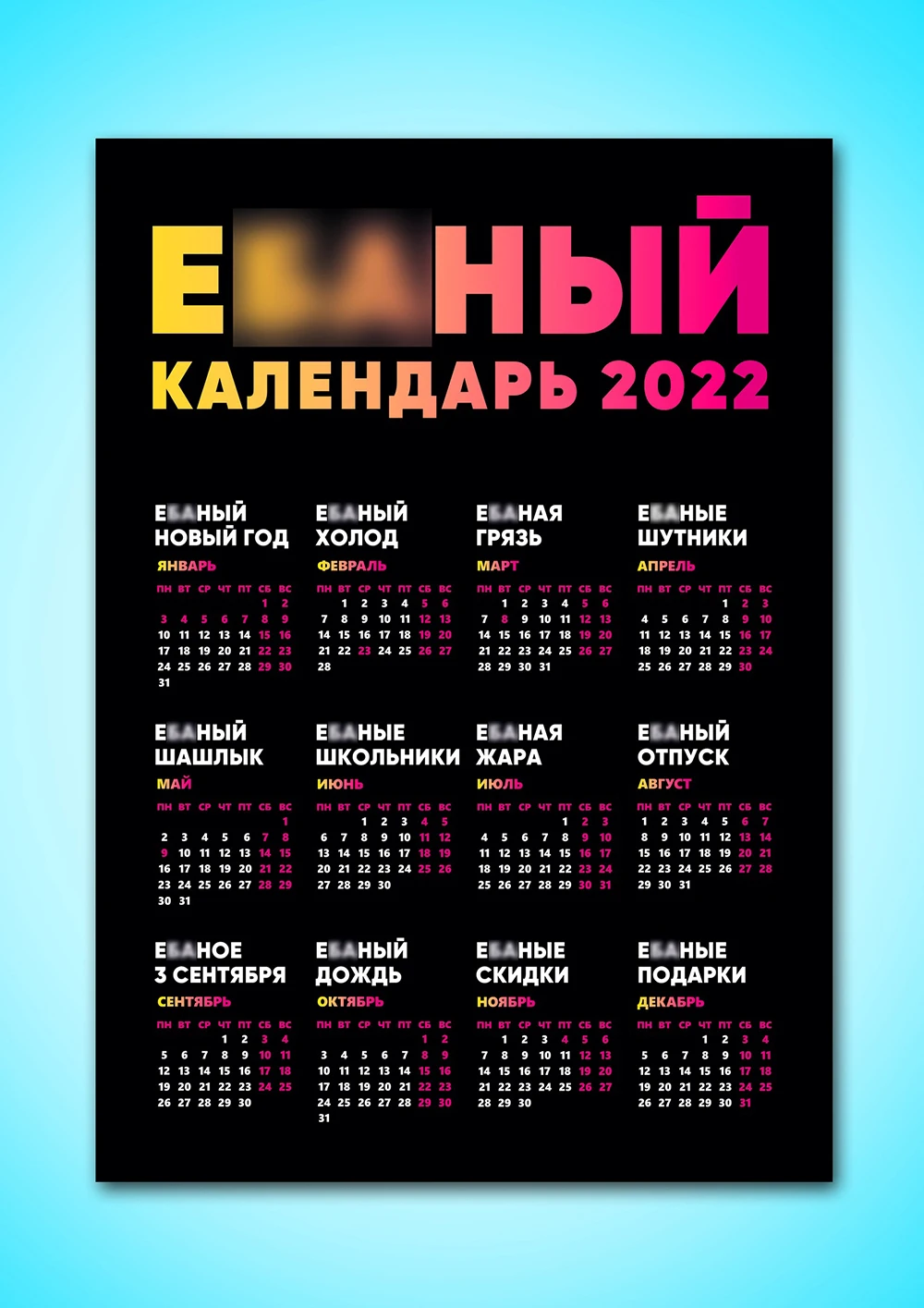 Ебаный календарь 2022. Классный подарок на любой повод. Такой календарь это классный декор который несомненно приведет в восторг всех окружающих и гостей. Новый тренд 2022 года. Календарь, который хотят все. Изготовлен из плотной бумаги для постеров. Формат А4 - 210х297 мм.