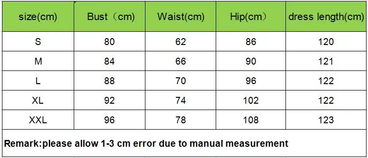 Примечание: Если вы не нашли подходящего вам размера в нашей таблице размеров, пожалуйста, оставьте нам сообщение и предоставьте свой обхват груди, талии, бедер, роста, веса, тогда мы сможем подобрать для вас размер по индивидуальному заказу. (Длина платья всего лишь 125 см).