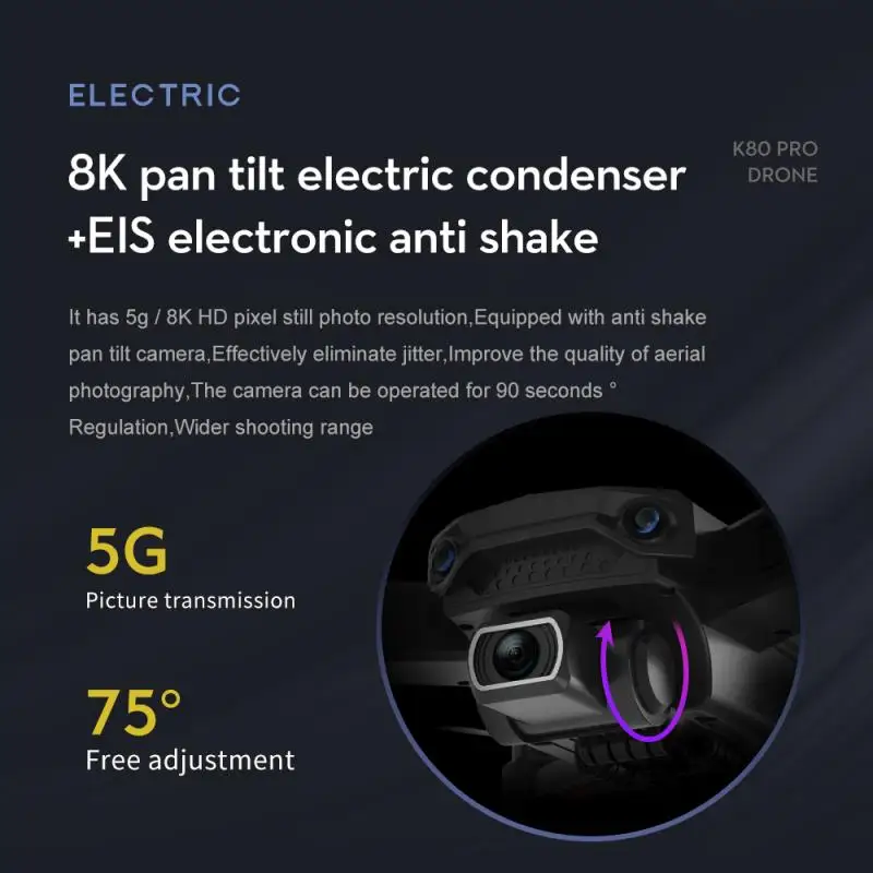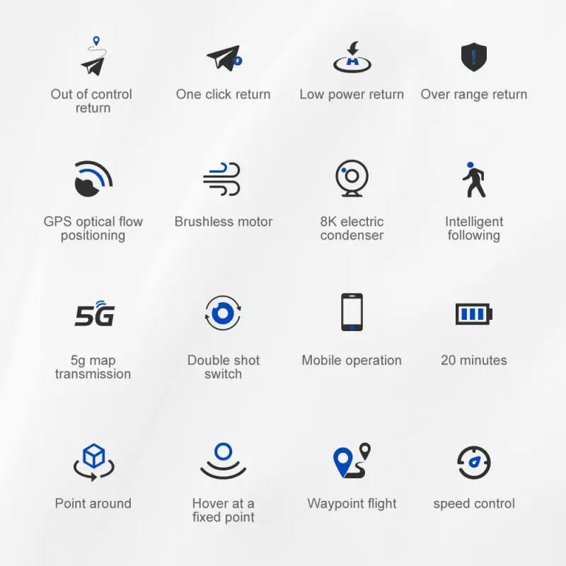 Из-за контроля возврата домой, один ключ возврата домой, низкая мощность возврата домой, сверхдальний возврат домой, Уровень 7 сопротивление ветра GPS оптическое позиционирование потока, бесщеточный двигатель, 8k ESC камера, умное слежение, фото/видео жестов, 5g передача изображения, объемное изображение с фиксированной точкой, наведение фиксированной точки, полет с путевой точкой, контроль скорости