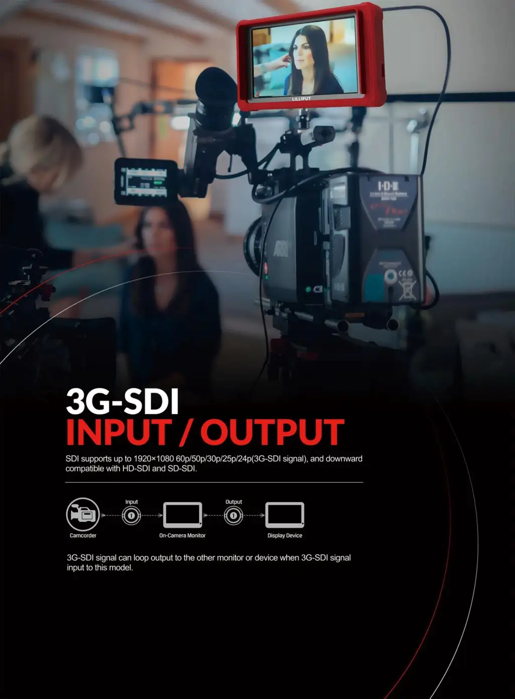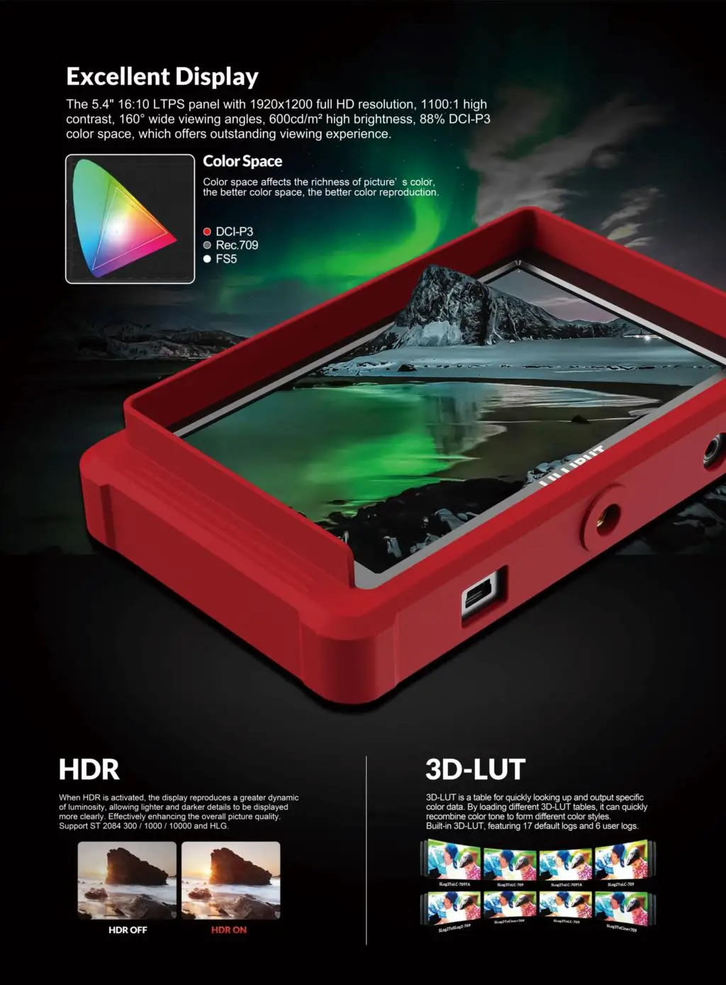 Профессиональный монитор на камере совместим с видеокамерой FHD/4K и dslr-камерой. 5,4 дюйма 1920 × 1200 Full HD родное разрешение экрана с тонкой качество картинки и Хорошая цветопередача. Порты SDI поддерживают вход сигнала 3G-SDI и циклический выход, порты HDMI поддерживают вход сигнала до 4K и циклический выход. Алюминиевый корпус, который эффективно повышает прочность монитора. Он также поставляется с превосходным экраном, который 88% DCI-P3 цветовое пространство, что обеспечивает выдающийся опыт просмотра.
