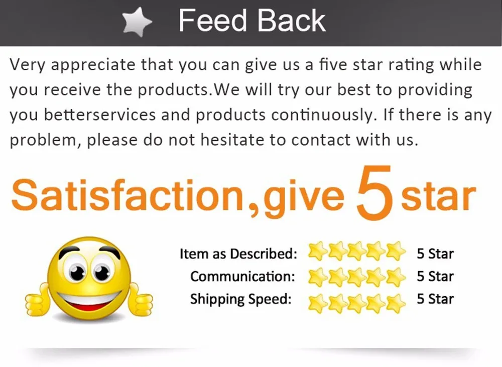 3.Отзывы очень важны для нас, пожалуйста, дайте нам 5 звезд положительные отзывы. Если у Вас возникли какие-либо проблемы, пожалуйста, свяжитесь с нами, мы рады помочь вам решить любую проблему