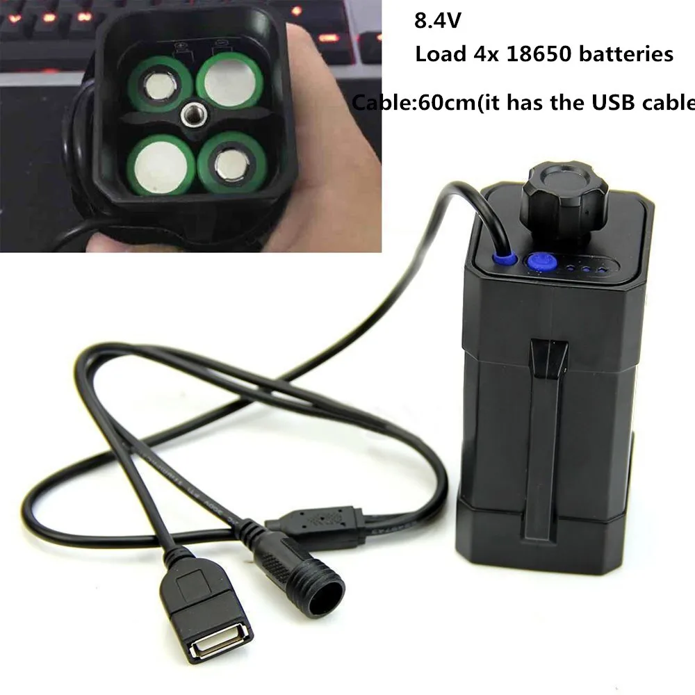 Может быть упакован в 4 литиевых аккумулятора 18650 и соединен с велосипедными лампами