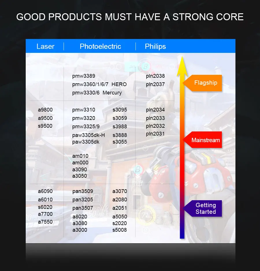 Основная модель нашего мышка P3389, которая лучше, чем CORE; >50 г ACC.400IPS 16000 кадров в секунду; 125/250/500/1000 Гц Частота опроса;