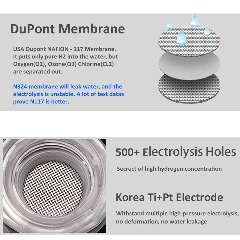 1, настоящая SPE (твердый Полимерный электролит) + PEM (протонная мембрана обмена) двухкамерная технология, корейский титан с платиновым покрытием.