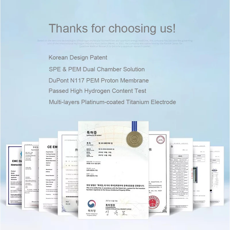 2, 100% безопасно для питья, чистота водорода достигает 99.99%. Кислород, хлор и озон разделяются, сбрасываются с устройства сброса отработанного газа.
