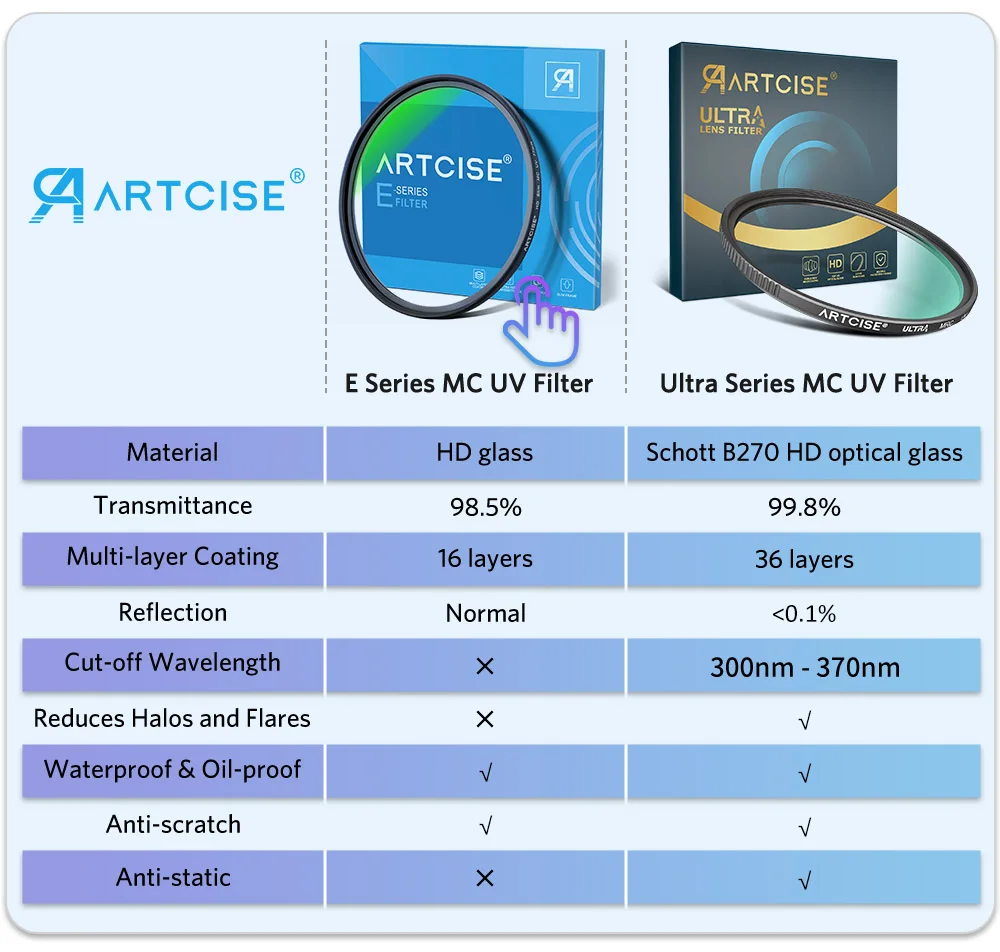 Фильтр объектива ARTCISE Ultra HD MC UV сделан из немецкого оптического стекла высокой четкости B270 для острых изображений бритвы, сохраняя при этом истинный цвет фотографий.
