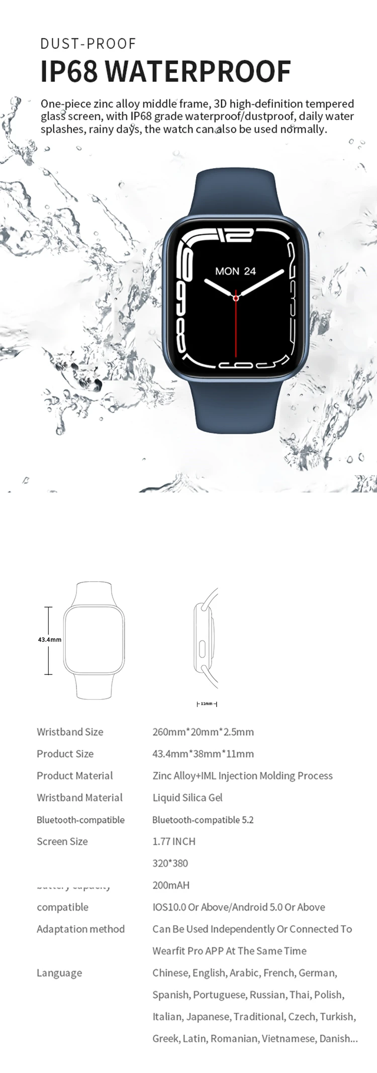 Цельная средняя рамка из цинкового сплава, экран из закаленного стекла высокой четкости 3D с водонепроницаемым/пылезащитным покрытием класса IP68, повседневные брызги воды, дождливые дни, часы также могут использоваться в обычном режиме.