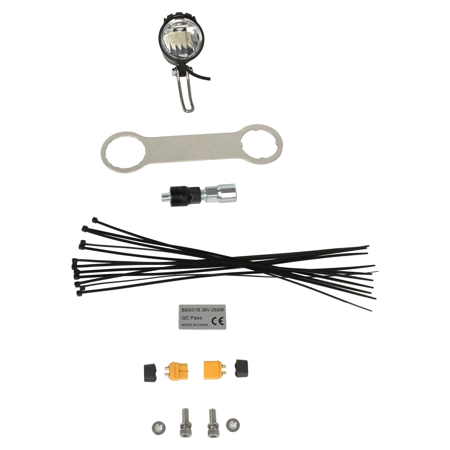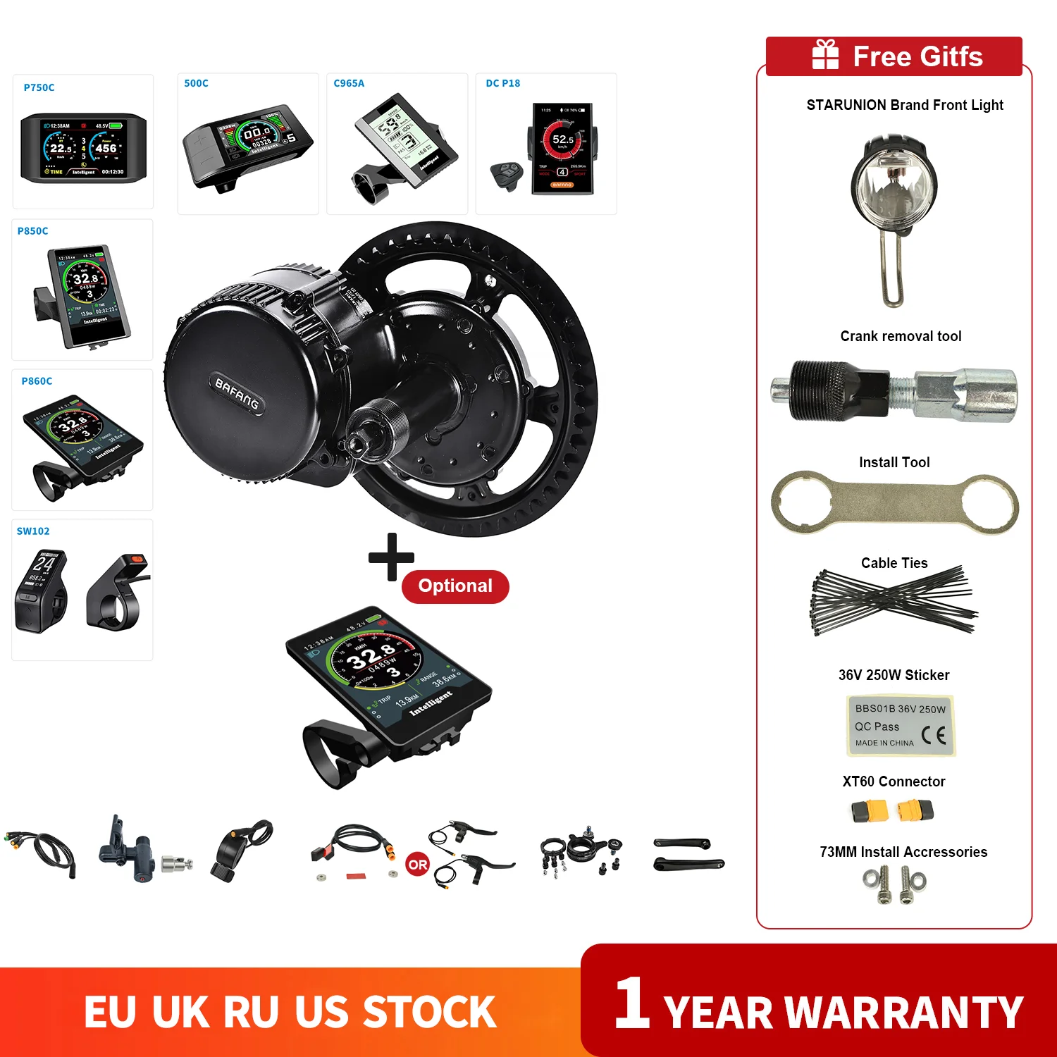 Подарки: бренд STARUNION передний светильник, инструмент для удаления кривошипов, инструмент для установки, кабельные стяжки, 36V 250W стикер XT60 коннектор, 73 мм установка аксессуаров.