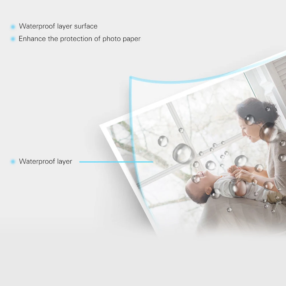 Водонепроницаемая поверхность слоя повышает защиту фотобумаги.