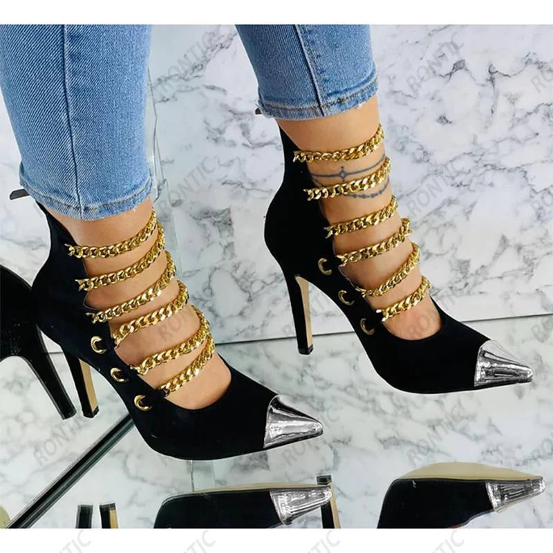 Rontic/женские туфли-лодочки ручной работы из искусственной замши с цепочкой и пряжкой; Шикарные Клубные туфли на шпильке с острым носком; Цвет золотой, серебряный; Американские размеры 5-15