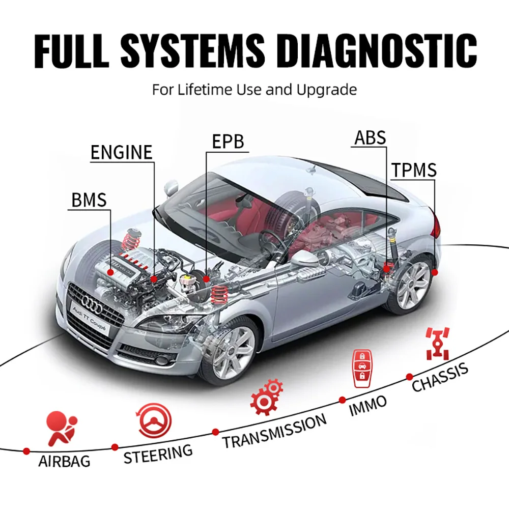 "С превосходными диагностиками всех систем, этот универсальный obd2 сканер может быть использован для чтения всех доступных систем ЭБУ информации, чтобы облегчить диагностику транспортного средства. Полные системы отличаются от различных автомобилей, и они обычно включают двигатель, трансмиссию, ABS, SRS, SAS, TPMS, EPB и шасси/корпус/электрическое оборудование и т. Д.