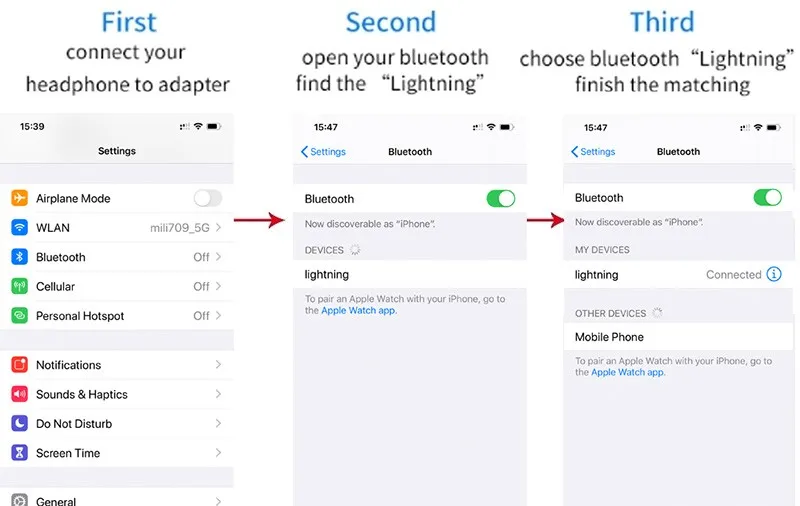 Пожалуйста, включите функцию Bluetooth в «Настройки» на мобильный телефон после того, как вставите его в мобильный телефон в первый раз. Bluetooth dev ice будет найден в мобильный телефон через несколько секунд. Имя устройства-Lightning. Нажмите на соединение сопряжения для успешного подключения и можете использовать его. В будущем вам нужно будет подключаться только автоматически при включении Bluetooth. Примечание: Для использования этого bluetooth-устройства сначала необходимо подключить его к iPhone.