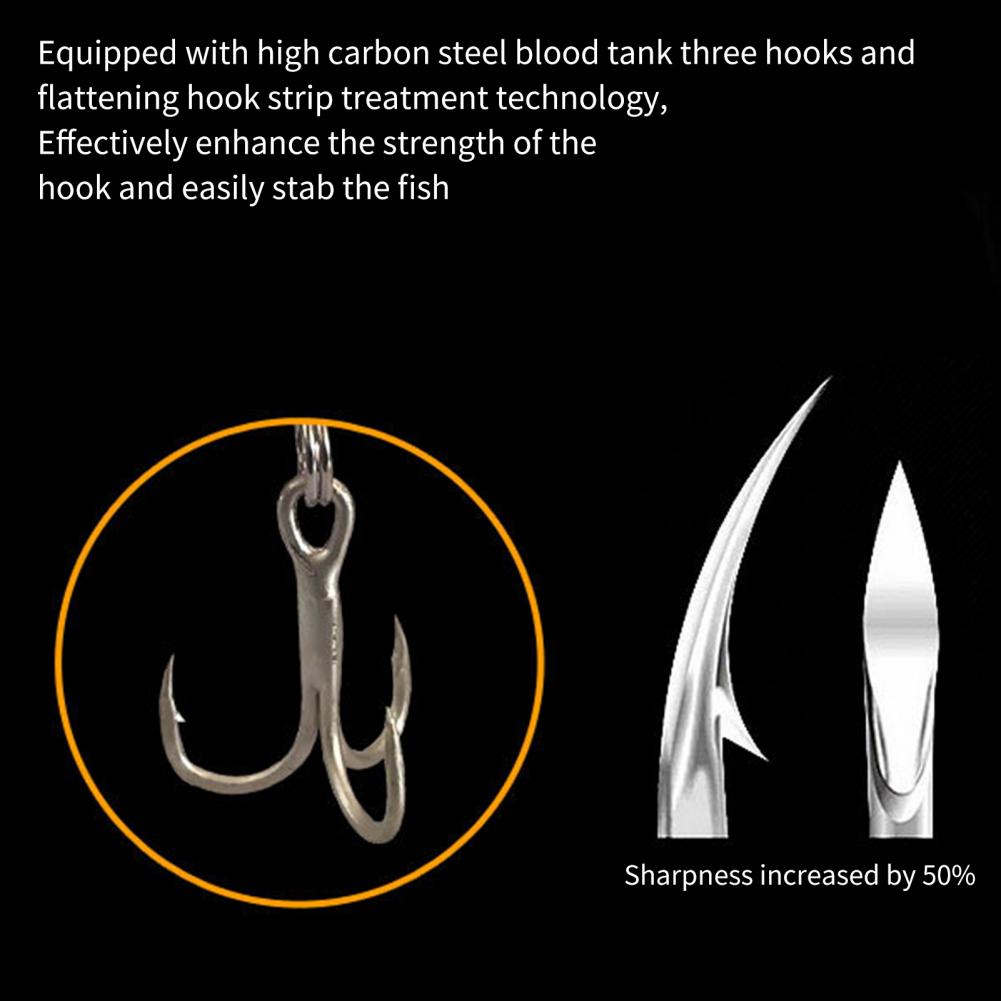 Высокоуглеродистая стальная структура повышает прочность тройного крючка и обеспечивает сильное проникновение. 3D дизайн глаз делает его более ярким и привлекательным.