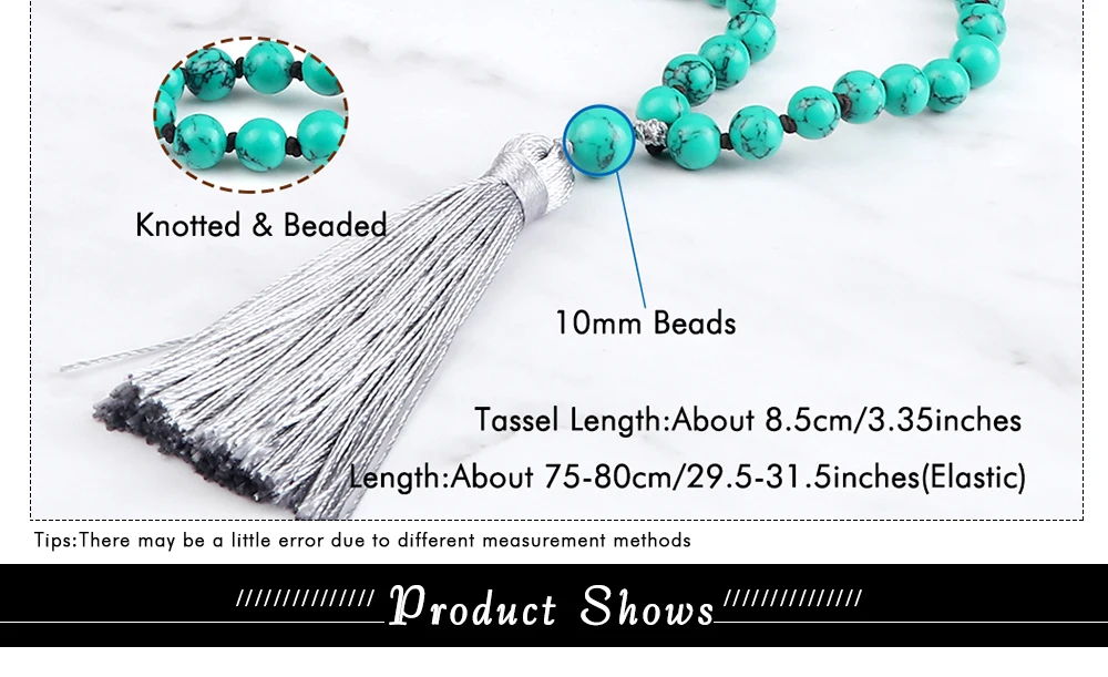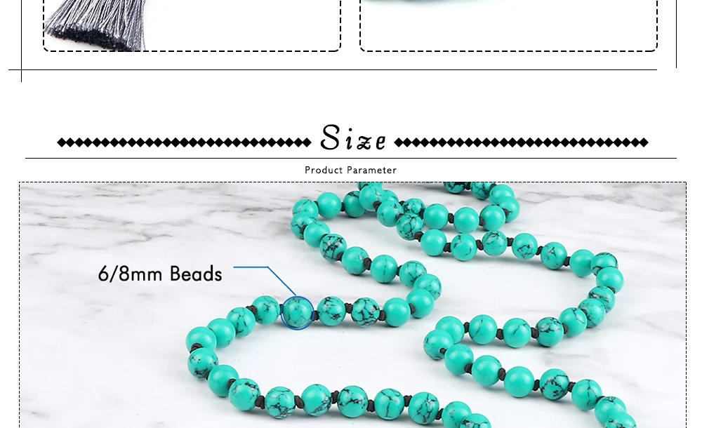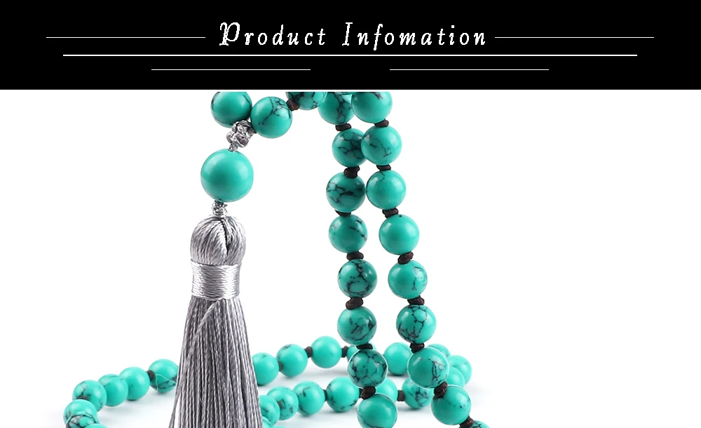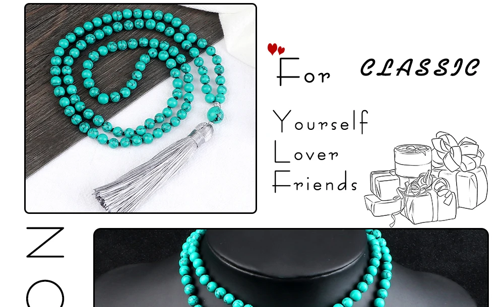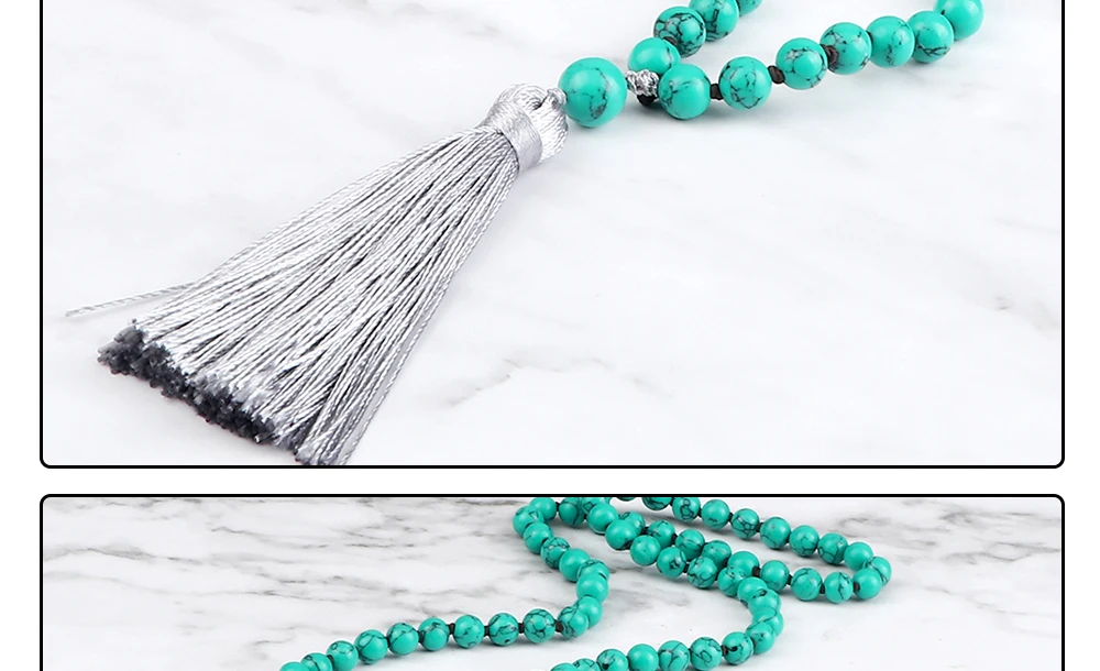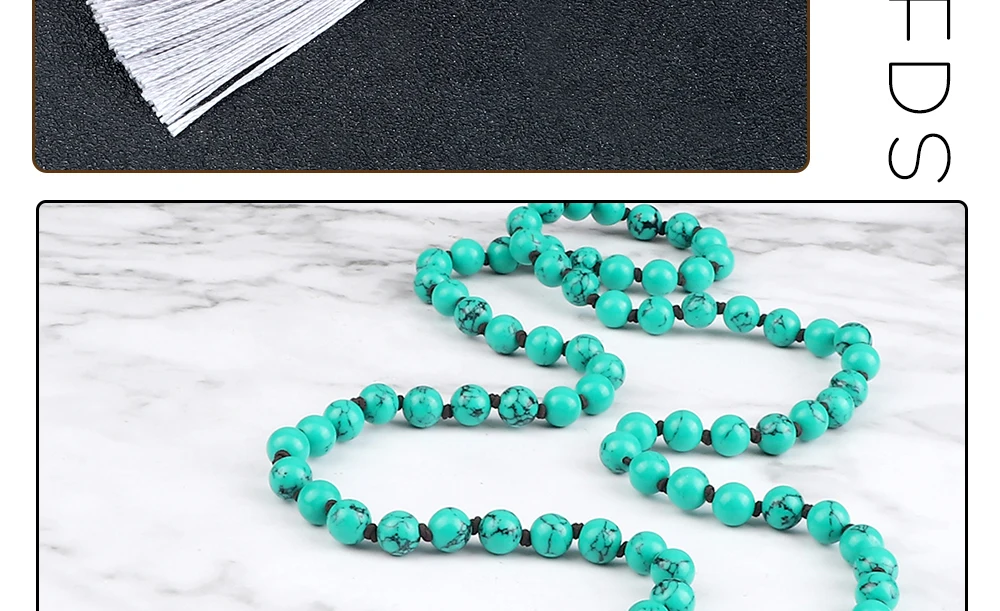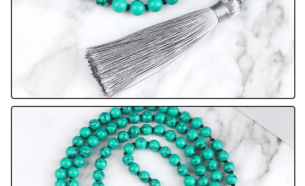 Прямая поставка, Очаровательное ожерелье Mala с бусинами, 6 мм, 8 мм, зеленый синтетический камень, узелковые Длинные ожерелья с кисточками для женщин и мужчин, цепочка для свитера, Йога, медитация, ювелирное изделие, подарок для влюбленных