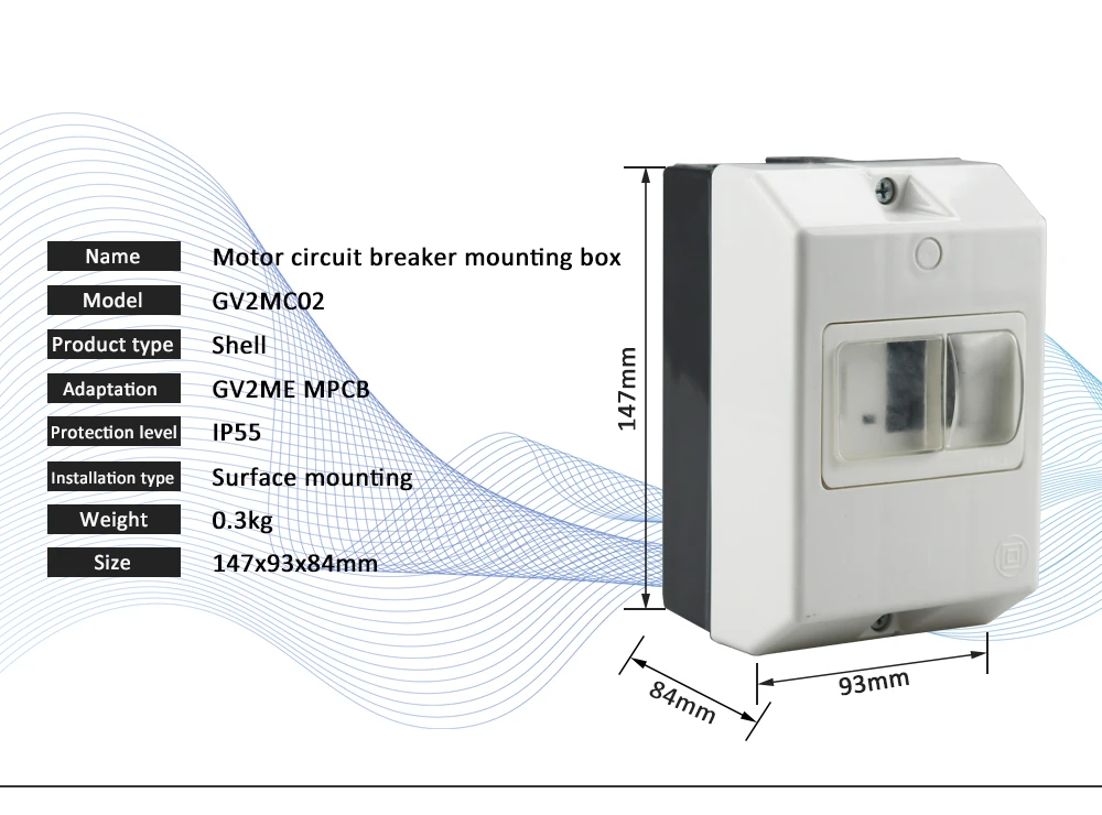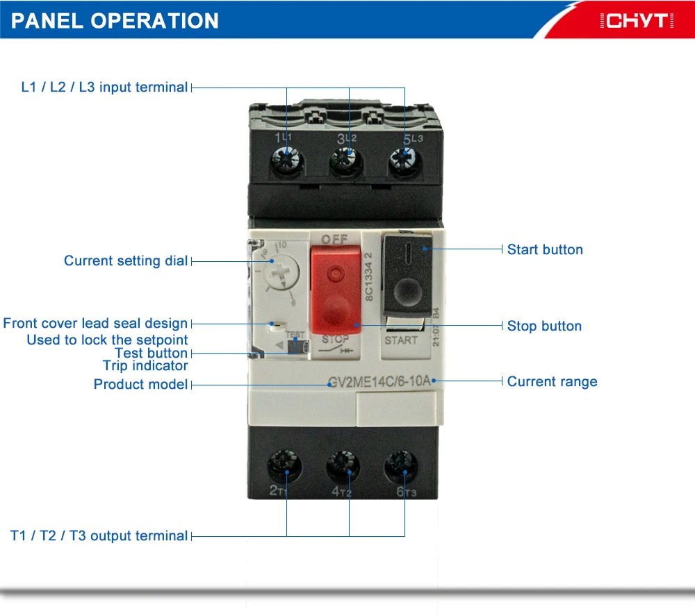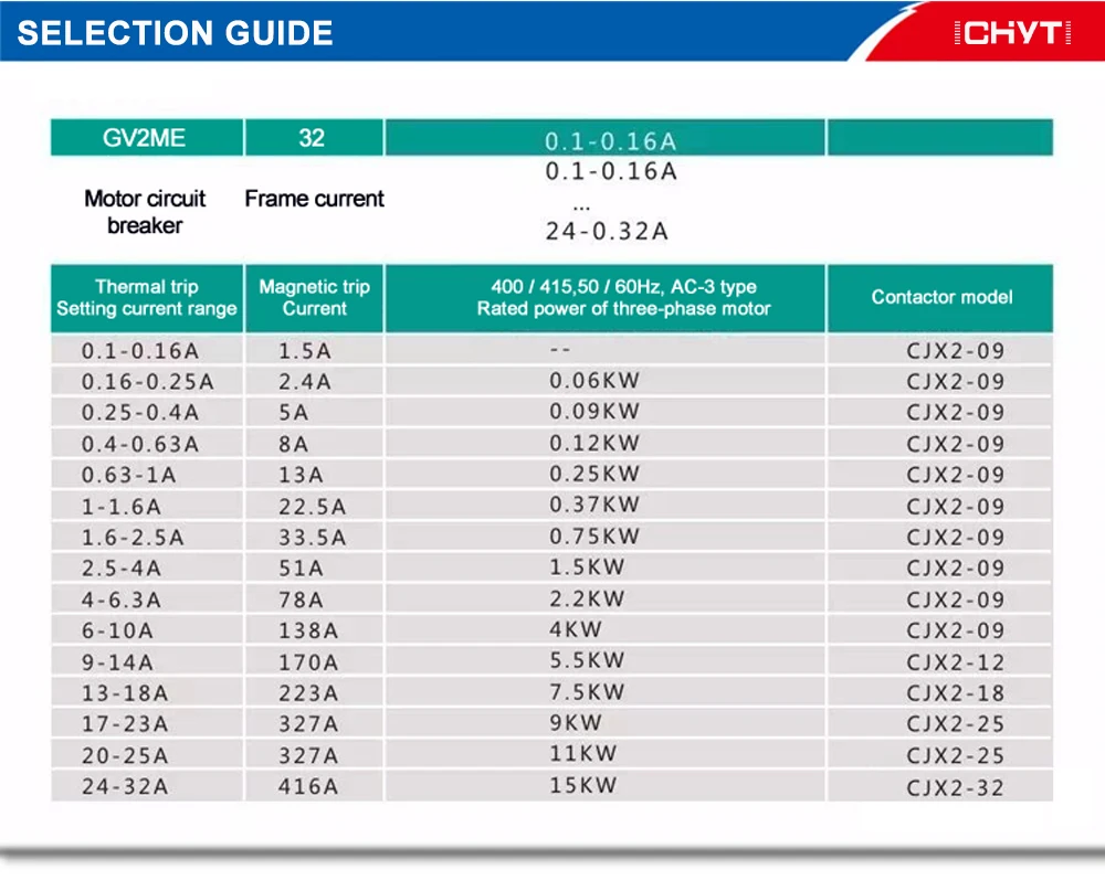 Автоматический выключатель двигателя переменного тока GV2ME применим к цепи с напряжением переменного тока до 690 В и током до 32А. Он может использоваться как защита от перегрузки, открытой фазы и короткого замыкания и нечасто запускаемый контроль трехфазного асинхронного двигателя клетки белки. Он может быть использован в качестве защиты распределительной линии, нечасто преобразования нагрузки и изолятор.